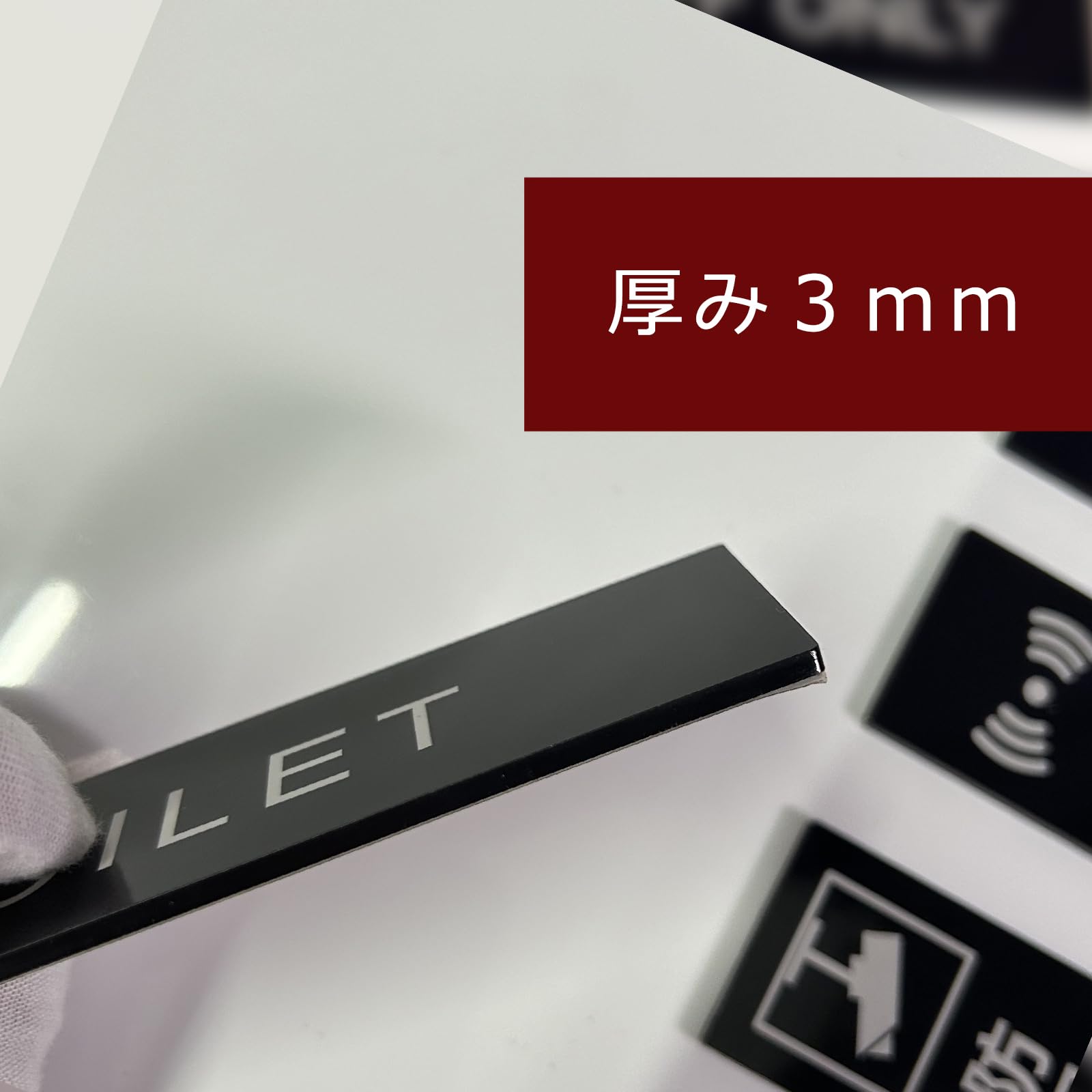 印刷面に3㎜のアクリル板が覆われ、防水性と対候性に優れています。屋外でもご使用できます。