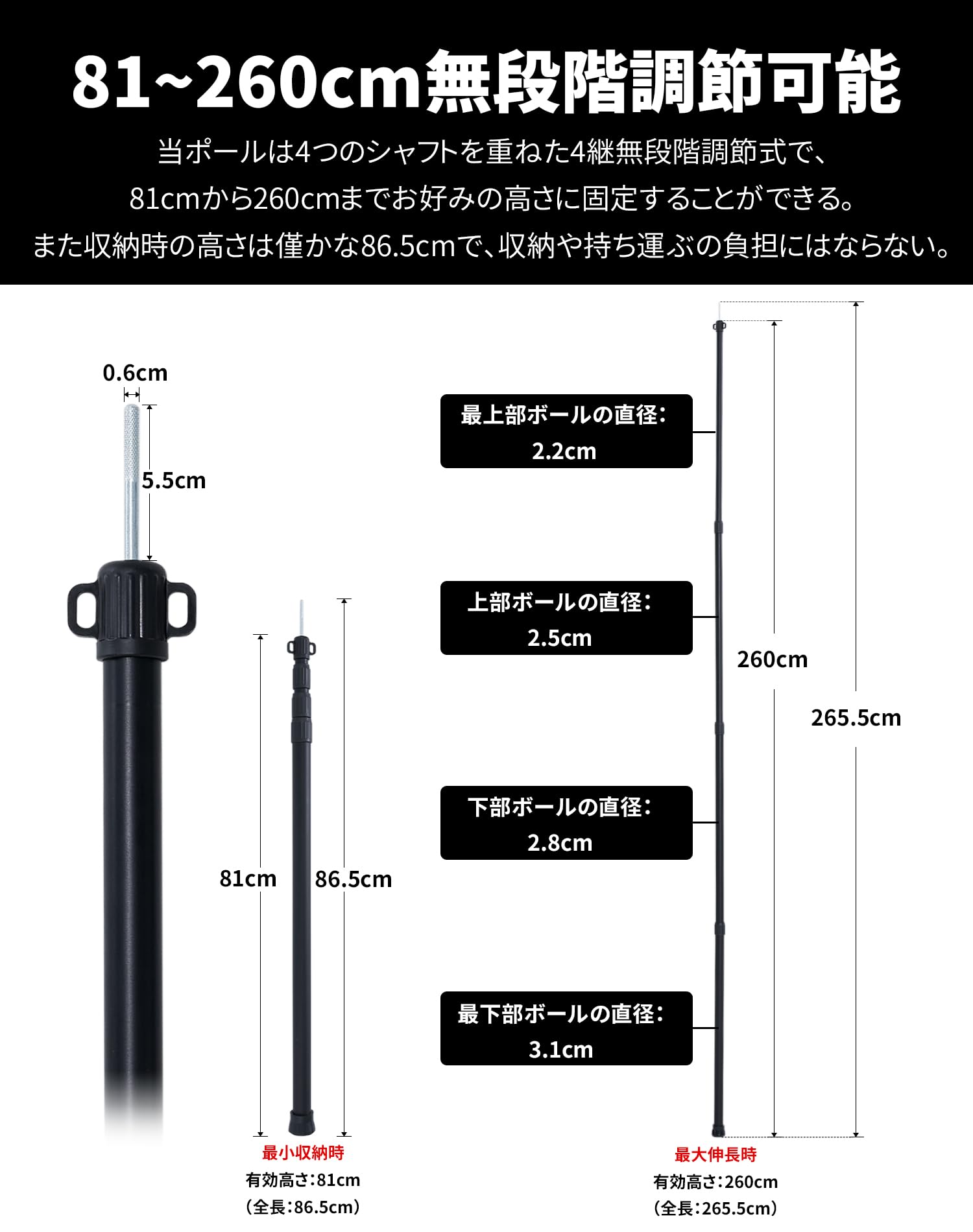 【無段階伸縮式テントポール】テントポールは4つのシャフトを重ねた4継無断階調節式を採用し、スライドさせ、回して固定するだけで、高さは無段階で81cm〜260cmに調節できます。手軽に長さを変えられるので設営後の高さ変更もラクにできます!