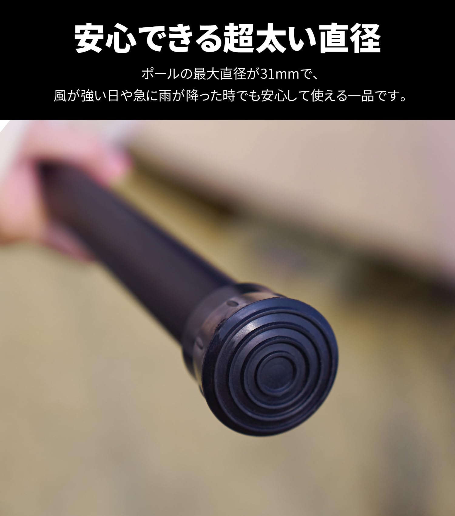 【使用シーン】最も太い部分の直径が31mmで風が強い時期にタープを張る場合や、大型のタープを支える場合に使えます。ポール長さを自在に調整できるので、サブタープポールやテントポールとして使えます。