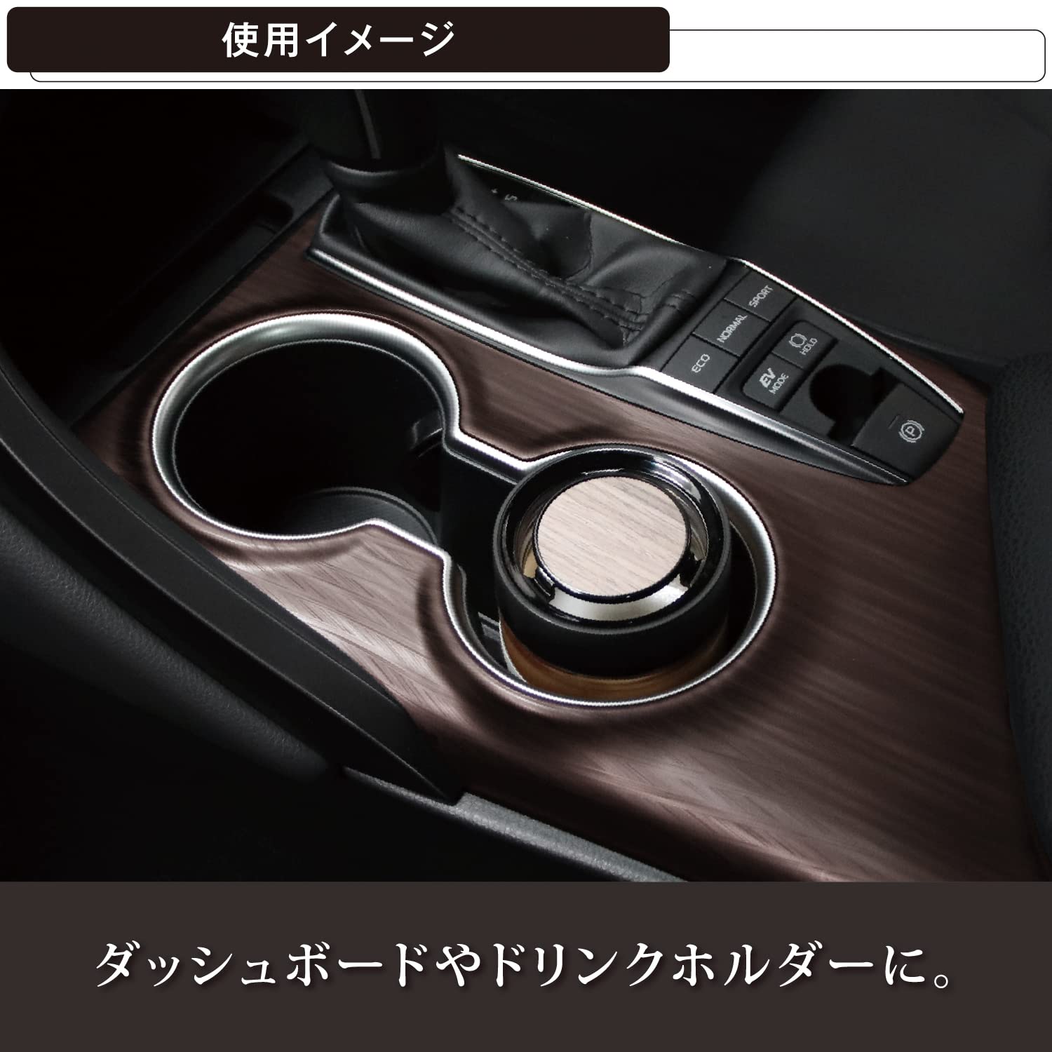 【自然な高級感を感じるボトルデザイン】ボトルキャップの天面には、天然のウッドシートを使用。アンバー塗装を施したガラスボトルと組み合わせ、見た目の心地よさを演出します。※天然のウッドシートを使用しているため、木目のバラつきや色ムラ等がありますが、自然の風合いをお楽しみください。ボトルの直径は65mmで、ほとんどのクルマのドリンクホルダーに置くことができます。