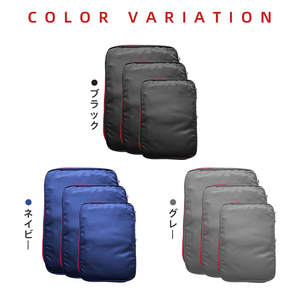 【日常でも活躍!スマートな収納ポーチ】旅行だけでなく、クローゼット整理や衣替え、防災グッズの収納など日常使いにもぴったり。SS・S・M・Lの4サイズ展開で、用途に合わせてお選びいただけます。