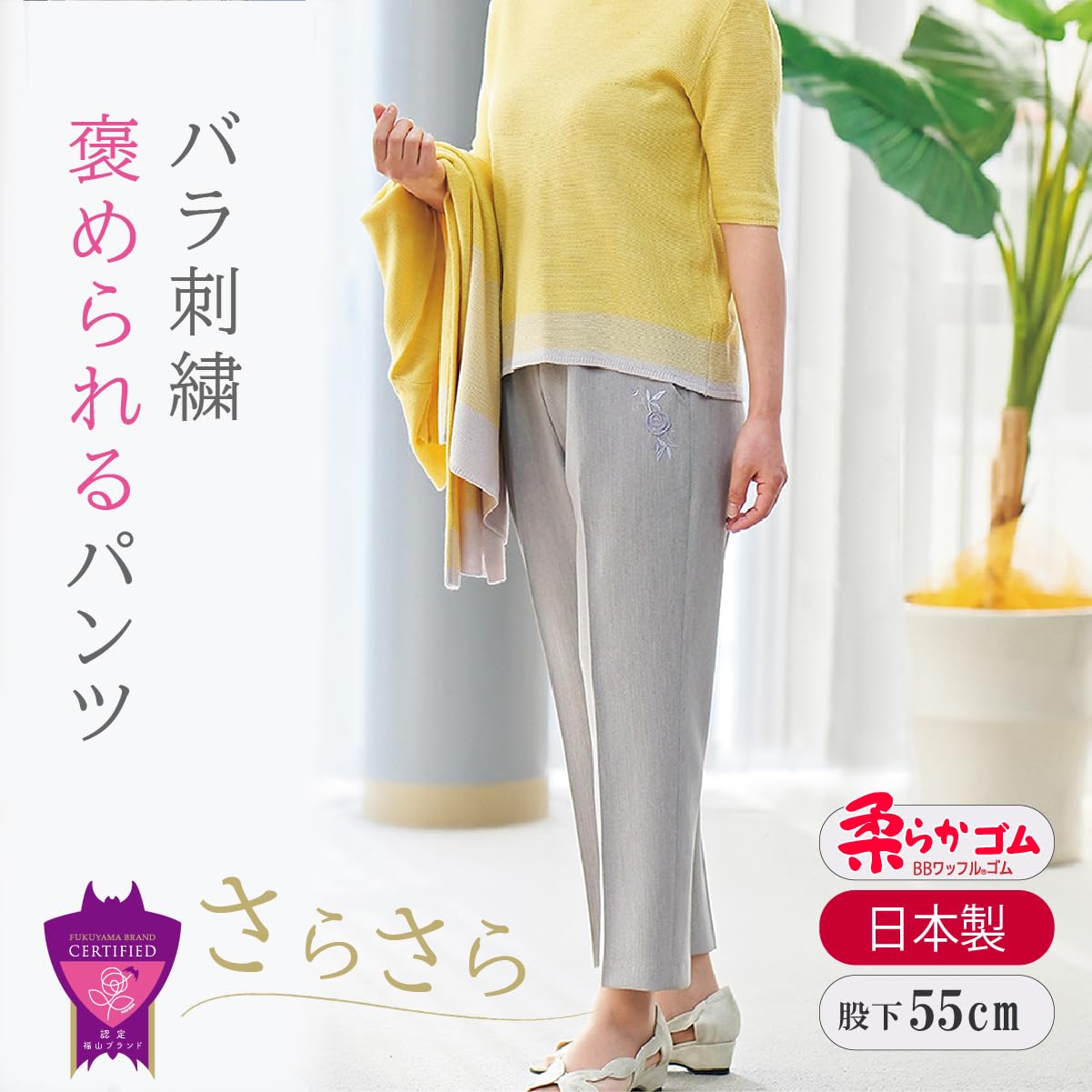 福山ブランドにも認定された上品なバラ刺繍を施した日本製パンツ。サイズ展開もS~5Lと幅広い展開です。