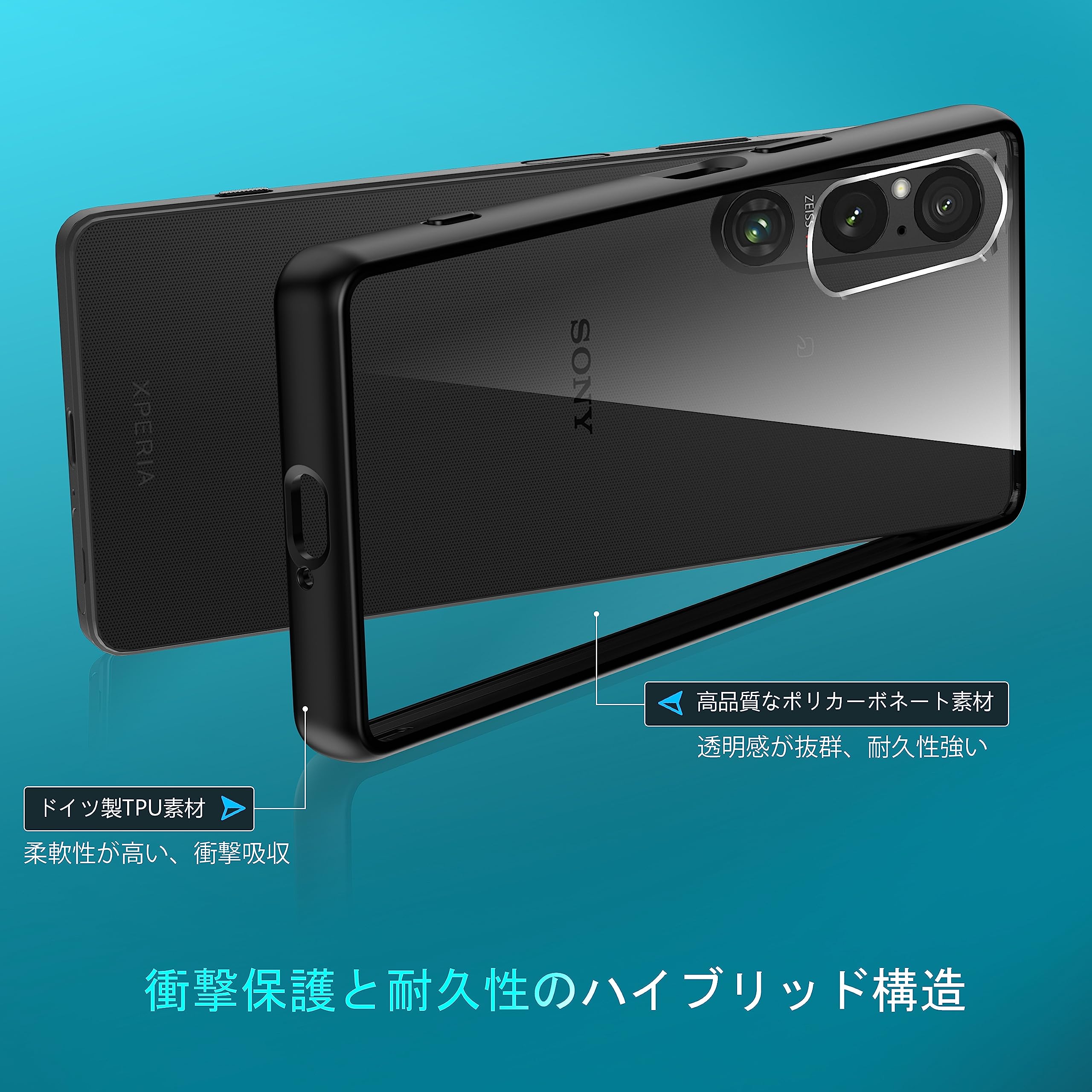 【水晶のような透明感と超高耐衝撃性】 Xperia 1 V [SO-51D|SOG10] 用ケース。透き通って高い透明度を誇り、背面がXPERIA1IVのカラーや質感をそのまま映え、高級感が溢れて、すごくかっこよくてこのクリア感にいつまでも見惚れてしまいます。米国国防総省の耐衝撃試験「MIL-STD-810G」に認証済み、耐衝撃性能は20倍アップ。圧倒的な耐衝撃性を誇り、エクスペリア1vを全方向からしっかりと保護できす。