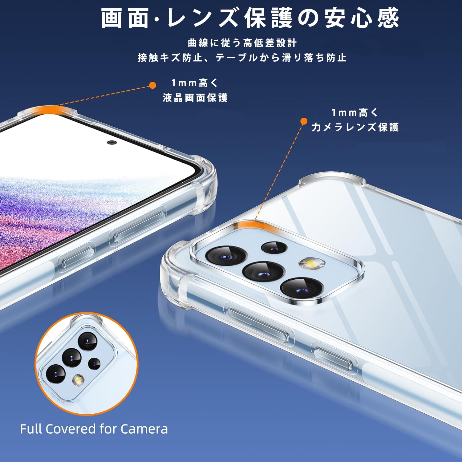 【全面の保護】Galaxy A53 5G の曲線に従う高低差設計。液晶画面やカメラレンズより1mmほど高め、卓上に置いても傷がつきにくく、併用のガラスフィルムまでも保護できる。更に、背面四隅には1mmの突起があり、滑り止めに効果で、ケース背面までも傷から守れます。