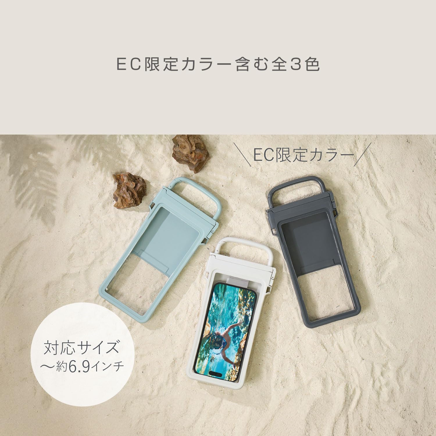 本体カラーは爽やかな「ライトグレー」「ブルー」、そしてEC限定カラーの「ダークグレー」の3色。海やプールはもちろん、キャンプや登山などのアウトドア、カヌーやSUPなどウォーターアクティビティまで幅広くお使いいただけます。※水上・水中でのスマホの顔認証システムはご使用できません。※使用環境、機種によっては、水中撮影やボタン操作ができない場合があります。