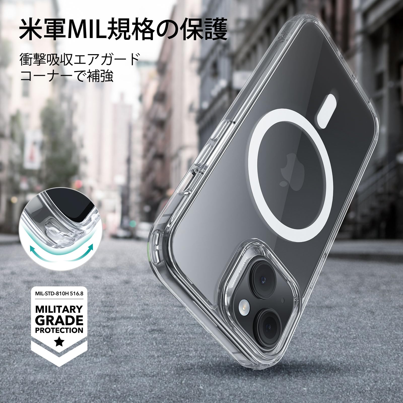 【米軍MIL規格の落下防止】すべての面を完全に保護できるよう厳密にテストされ、特別に設計された衝撃吸収エアガードコーナーにより、スマホへの衝撃を和らげます。米国防総省制定米軍MIL規格に完勝(認証番号:No.GZIN2005022739PS)。対応機種: iphone15 ケース