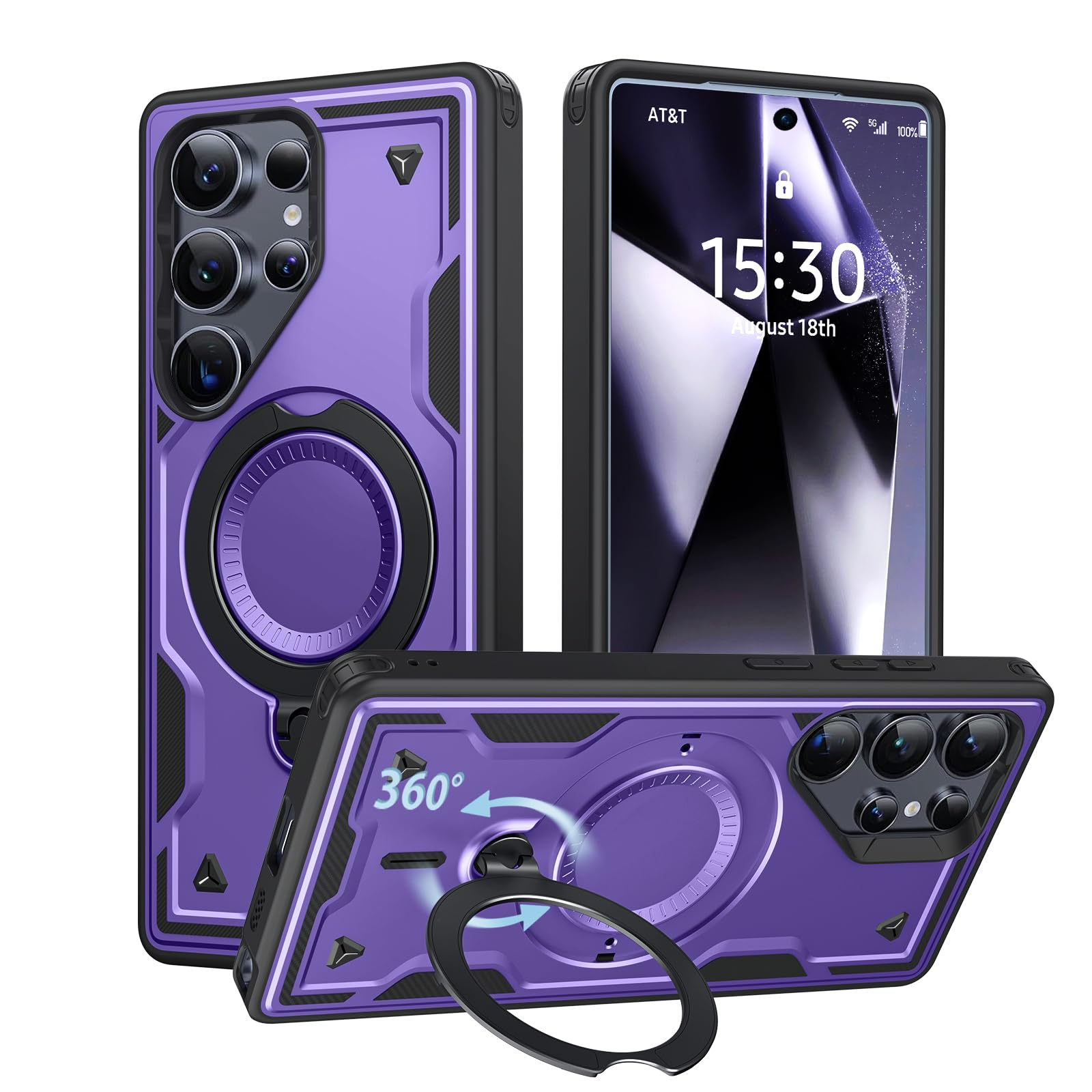 Galaxy S25 Ultra 用 ケース リング付き 隠しスタンド SC-52F SCG32 ギャラクシー S25 Ultra ケース 耐衝撃 縦横両対応 マグネット搭載 米軍MIL規格 360度回転スタンド 車載ホルダー ワイヤレス充電 携帯カバー 紫 Q-TH-S25U-05
