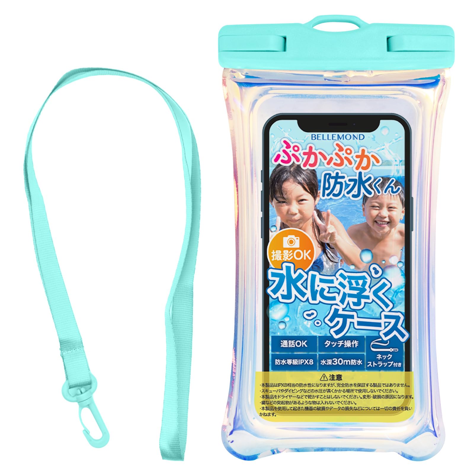 ベルモンド スマホ 防水ケース お風呂 【 IPX8 / 顔認証/水に浮く/水中撮影 】首かけ 海 プール 釣り/iPhone 16 15 13 12 pro max 対応 携帯電話 防水 ぷかぷか防水くん #11 オーロラ×サマーグリーン B0915