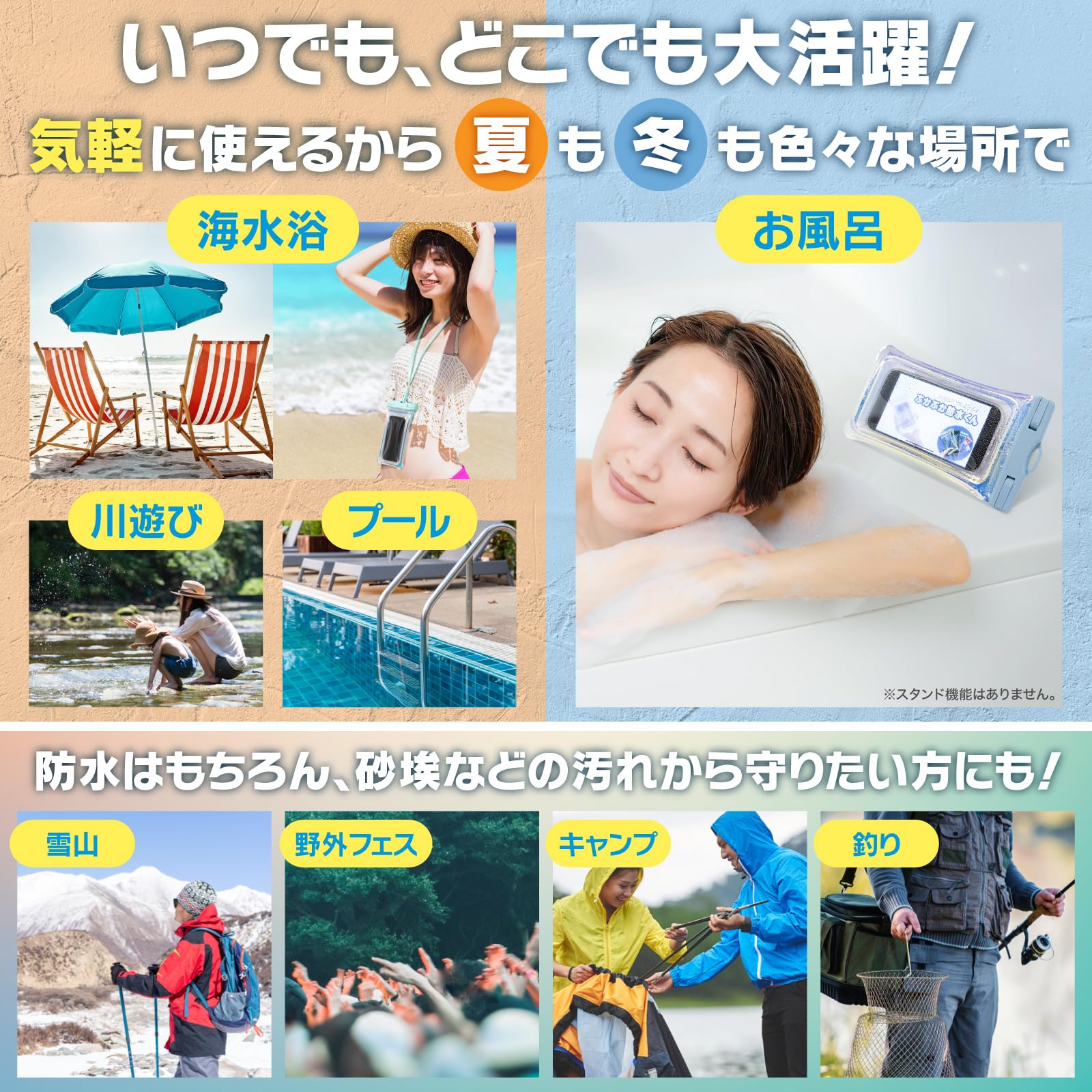 ???【活用シーン】海水浴、プール、川遊び、雪山でのスノボーやスキー、お風呂、キャンプ、釣り、野外フェス、バイクでの配達など軽量で簡単に使えるので様々なシーンで仕様できます。【対応操作】音声通話、ビデオ通話、動画鑑賞、音楽鑑賞、写真撮影、動画撮影(すべて水中では使用できません)