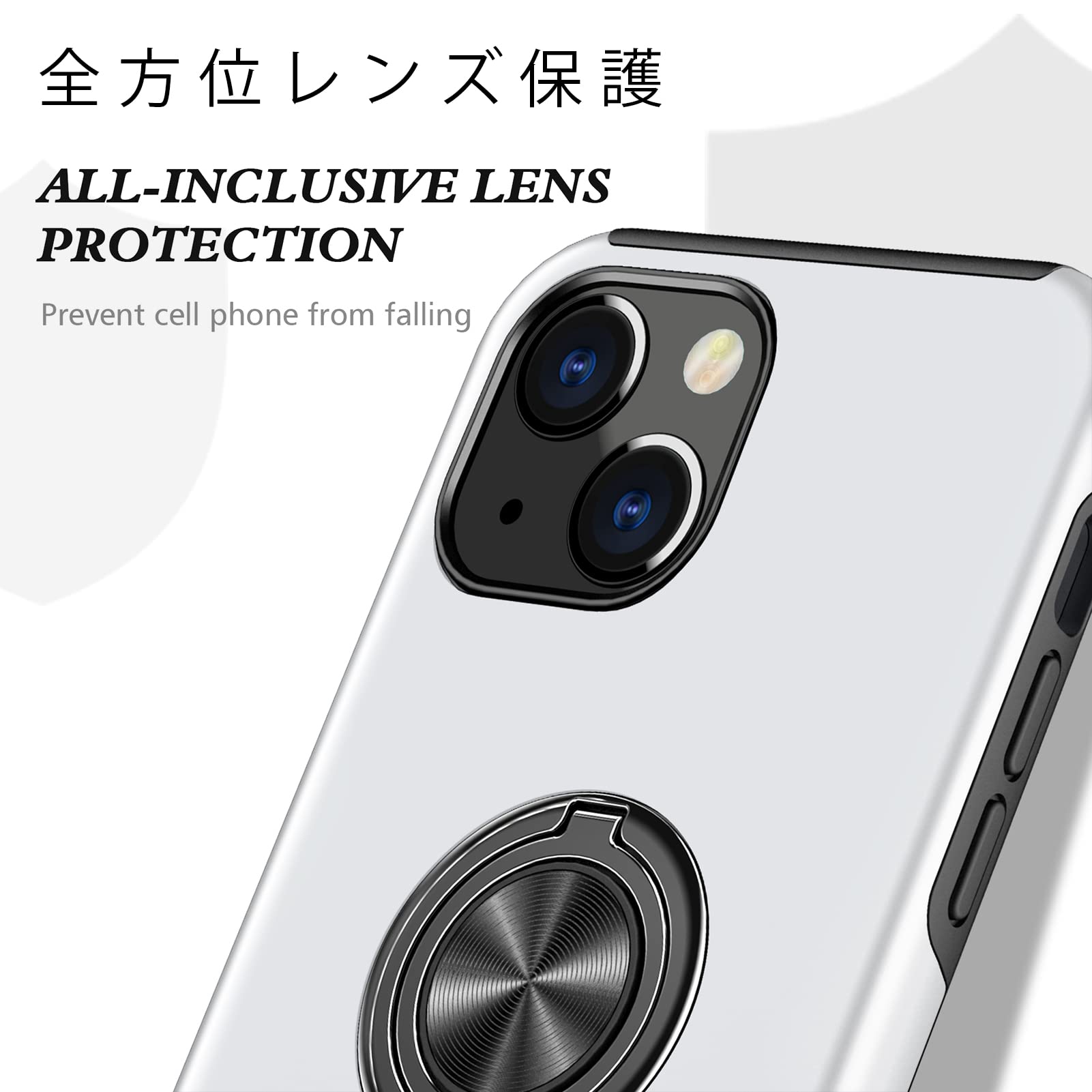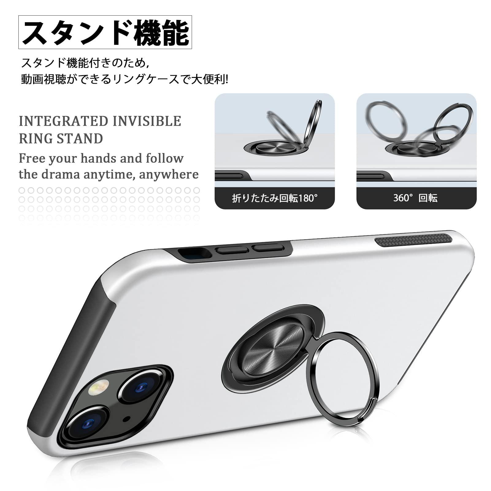 iphone13 mini ケースリング 耐衝撃 カバー 薄型 tpu 衝撃吸収 指紋防止TPU+PC材質 車載ホルダー対応 滑り止め 落下防止 リング付き スタンド機能 傷つけ防止 全面保護 一体型 カバー 銀08003-A13 mini-04