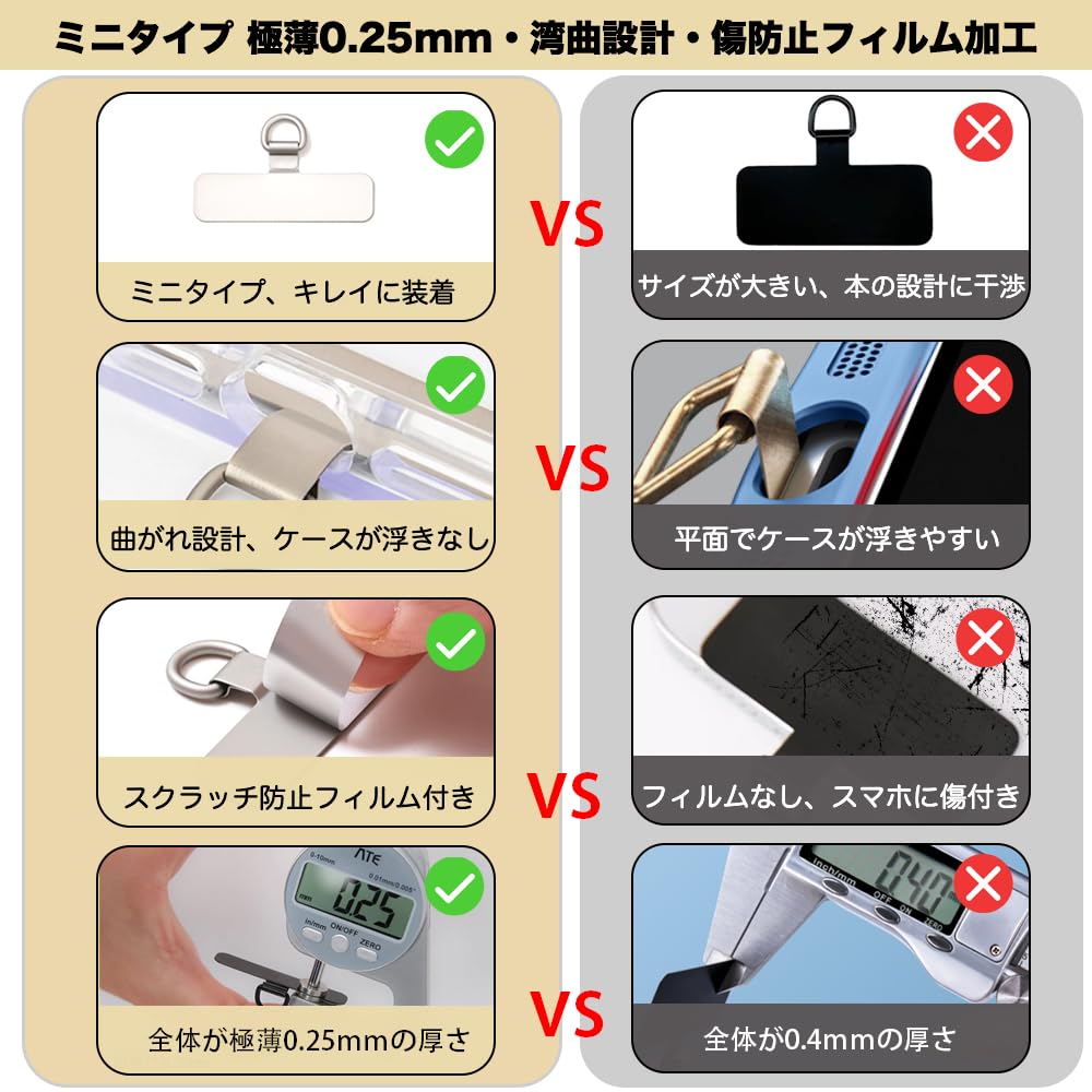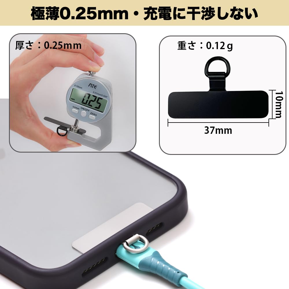 スマホ ストラップホルダー 【ミニタイプ 極薄0.25mm・湾曲設計・傷防止フィルム加工】ステンレス製タグパッチ 携帯ストラップホルダー 薄型 金属製で丈夫 10kgまでの荷重量 傷防止フィルム加工 スマホケースに挟む 全機種対応 充電影響なし 落下紛失防止 (ミニ-シルバー)