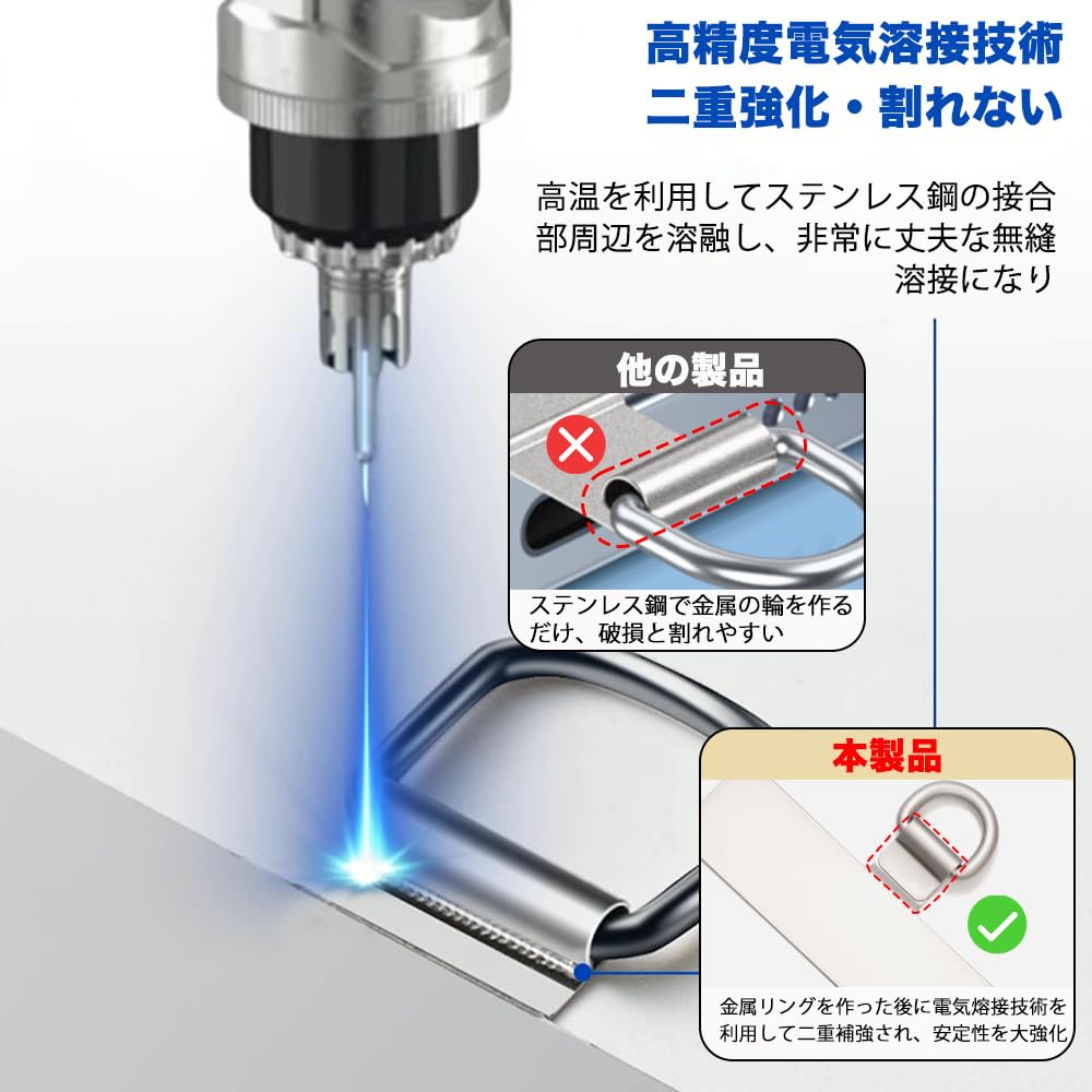 【機械電気熔接技術、割れない】:目前、ステンレス鋼で作った製品は金属リングと本体の間での連結金属部分は使用時間が長くなり、折れやすい問題があります。弊社はこの問題を解決しように、この連結金属部分が電気熔接技術を採用して二重補強されて、製品の安定性と荷重性を大きく強化し、裂け、破損と割れなど問題を完璧に解決し、様々なアウトドア活動の中にごスマホをしっかりと守ります。