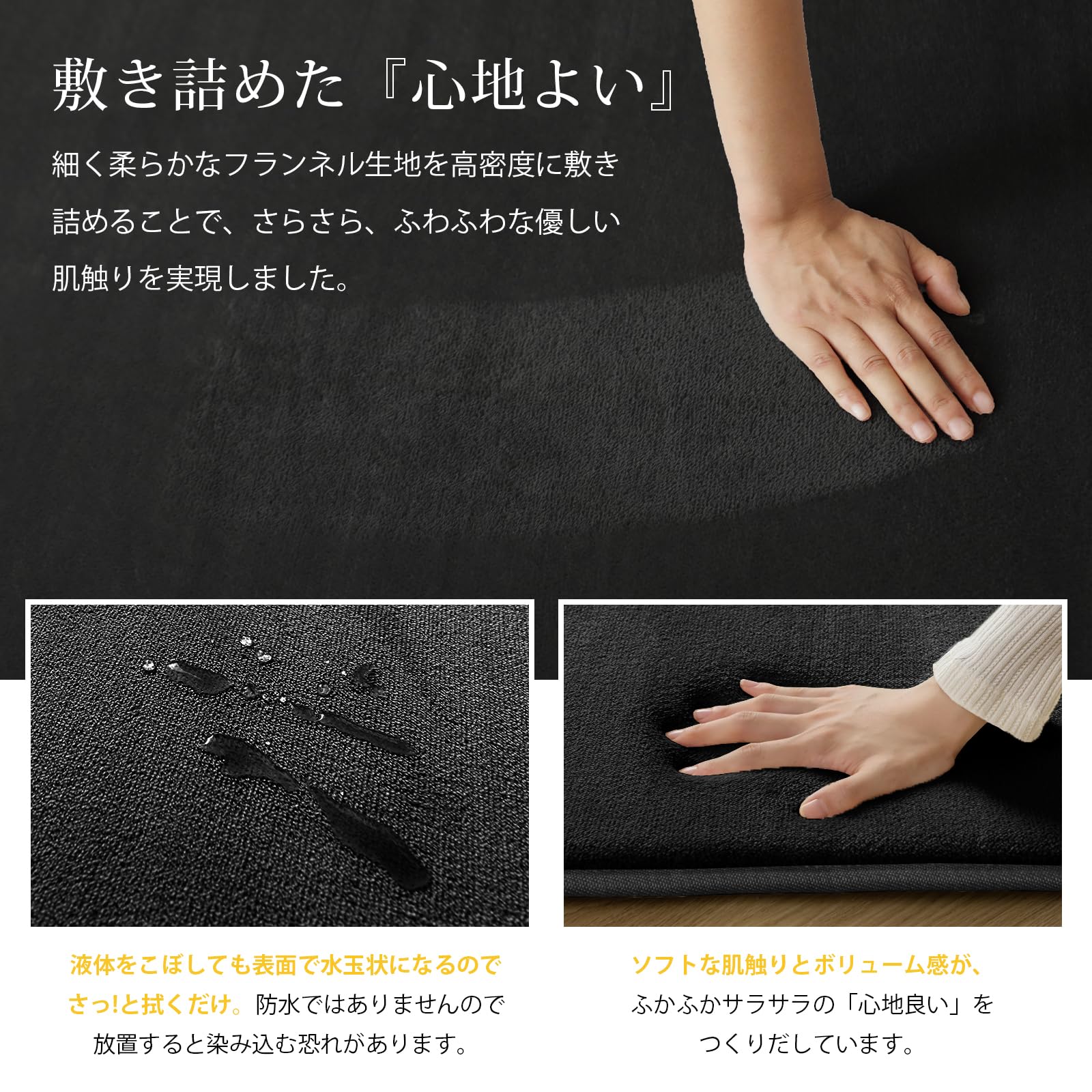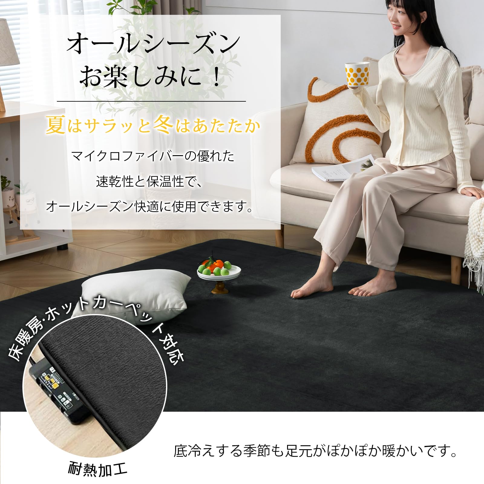 【オールシーズンお楽しみに】絨毯表面は細く柔らかなフランネル生地を高密度に敷き詰めることで、さらさら、ふわふわして優しい肌触りを実現します。極細マイクロファイバーは軽くて、保温性や速乾性も優れているので、夏はサラッと冬はあたたかい!床暖房・ホットカーペットも対応し、底冷えする季節も足元がぽかぽか暖かいです。