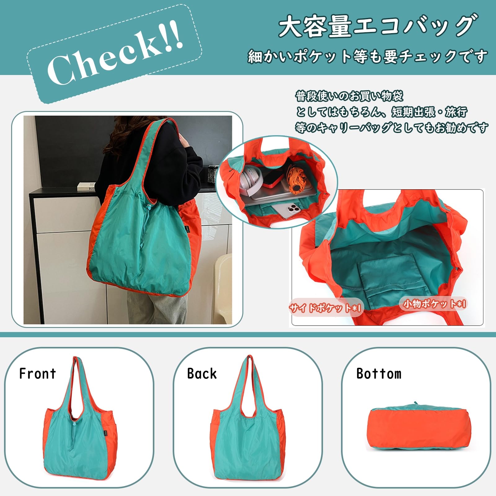 [Senteria] エコバッグ 折りたたみ 巾着 大容量 おしゃれ 丈夫 撥水 買い物 軽量 男女兼用 買い物袋 折り畳み 大きめ 繰り返し使える コンビニ トート 耐久性 コンパクト バイカラー