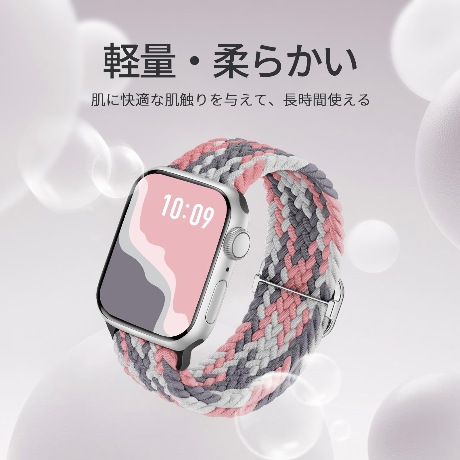 【対応機種・サイズ】アップルウォッチ バンド。Apple Watch Ultra 3 2 1 Series 11 10 9 8 7 6 SE 5 4 3 2 1 全機種対応できます。伸縮性である設計で、115mm—228mmの手首サイズに適しています。バンドの長さも無段階で自由に調整可能で、どんな手首にフィットできます。男女兼用のApple Watch バンドです。