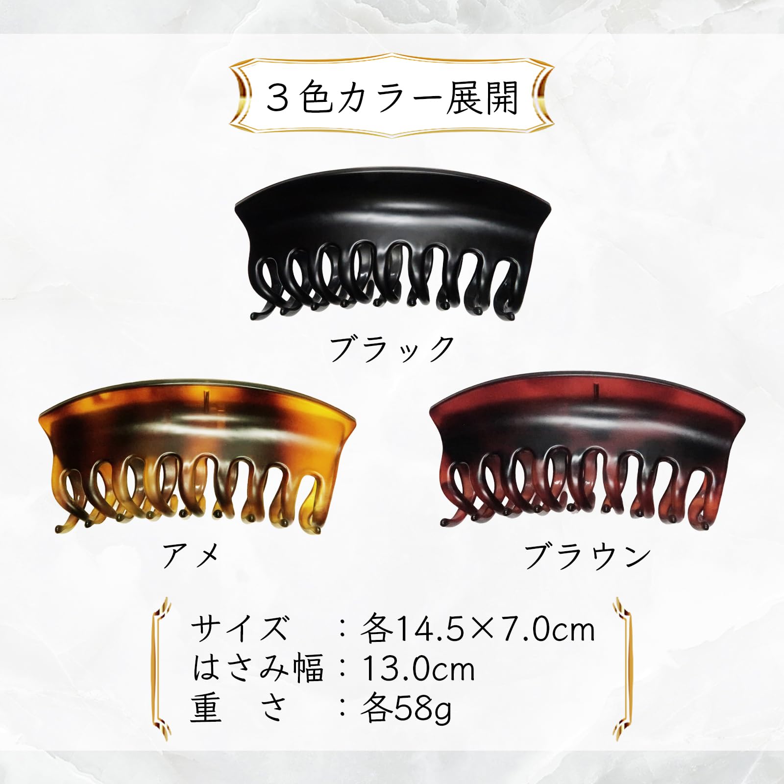 市場最大級の大きさ、バネも強力なので、どんな多い髪もがっちりホールドします