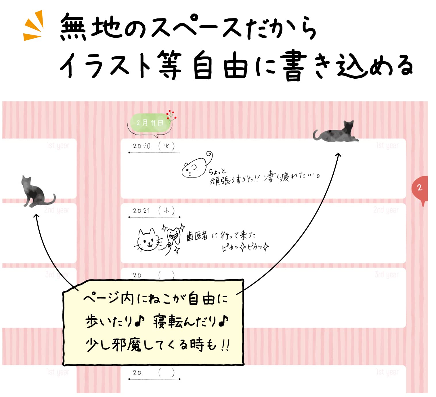 【新着商品】【フルカラー、 b5 (26cm×18cm)】 日記帳 3年日記 日本製 ノートライフ 開きやすく書きやすいPUR製本 ねこ ソフトカバー 日付あり (いつからでも始められる)
