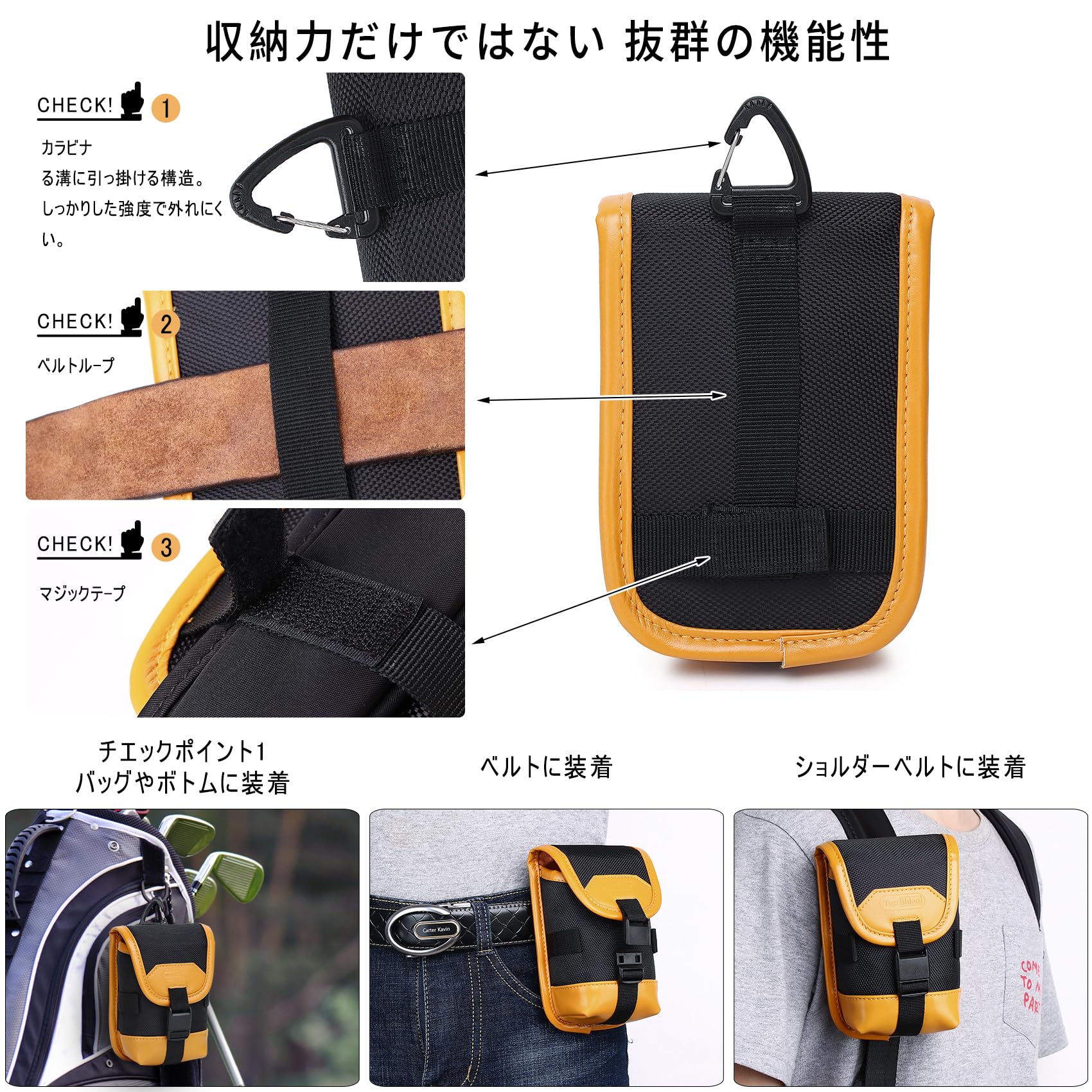【装着、持ち運び便利】 ラウンド中はベルトループやカラビナで腰に装着、ラウンド後は、カラビナやマジックテープでキャディバッグや肩紐に簡単に装着。リュックサックにも装着便利で、ゴルフ 便利グッズとしてご利用いただくほか、アウトドアシーンなど、使い方は色々です。