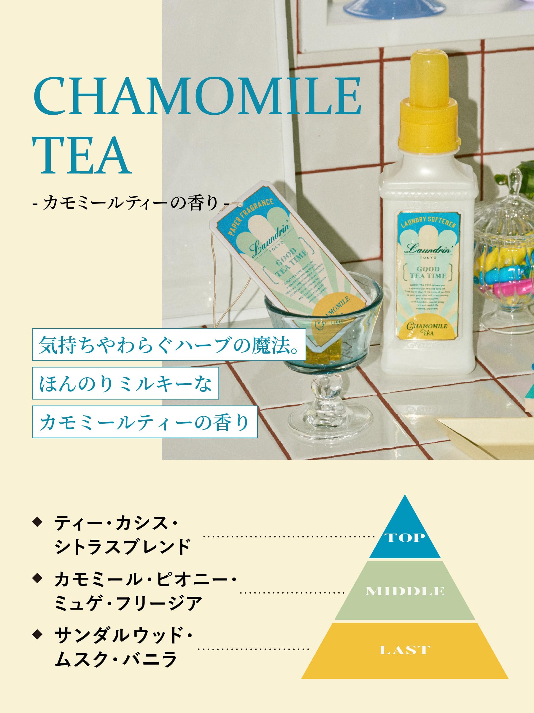 いつもの時間がもっと楽しくなるティーフレグランスシリーズ、カモミールティーの香り。摘みたてのカモミールとほんのりミルキーな優しさで、心がほっと安らぐ香り。
