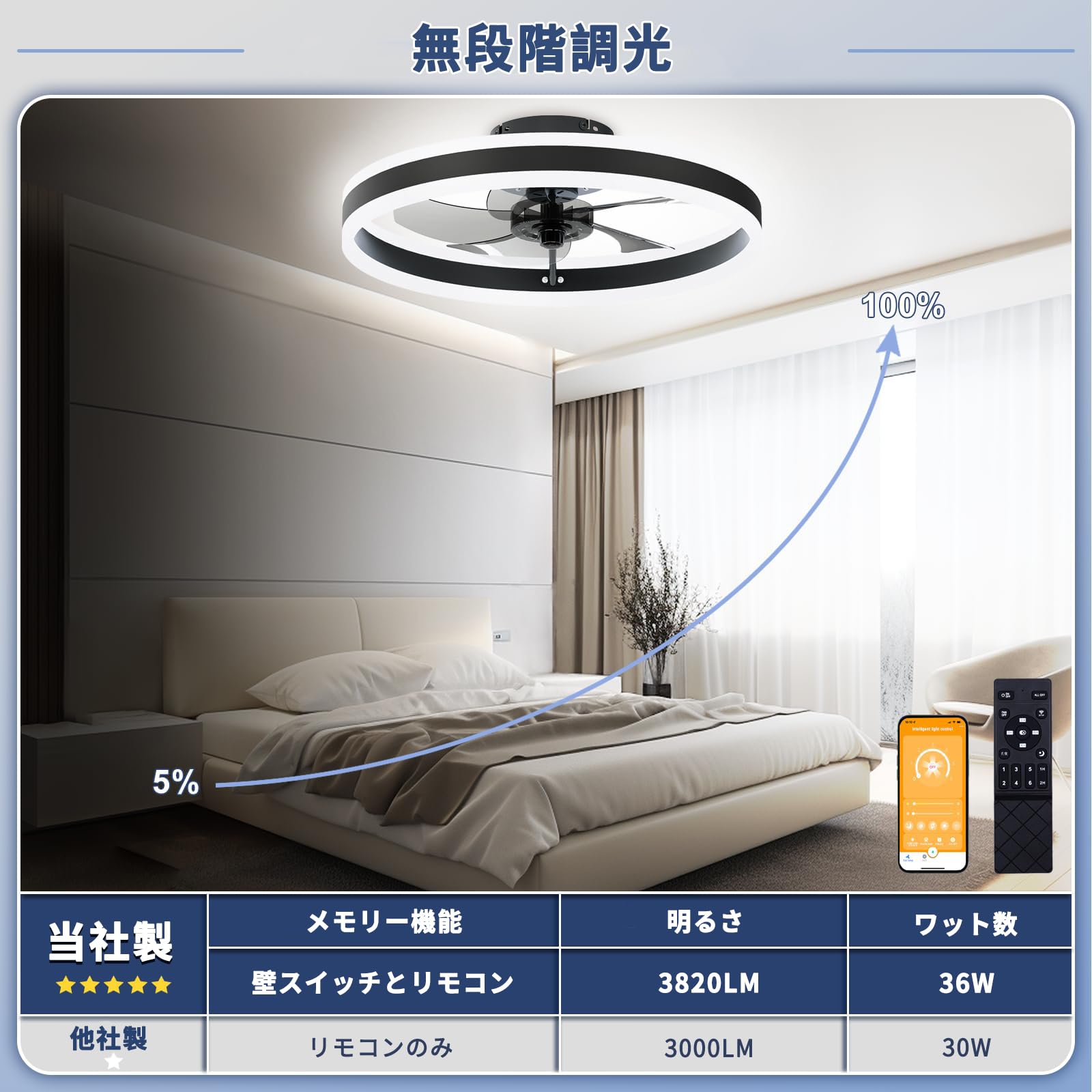 【リモコン&スマホ操作】リモコン・スマホの2種類制御方法。ファンライトは、スマートリモコンとモバイルAPPによって制御されます。 2時間タイマー機能や常夜灯機能も付いています。ほとんどのニーズを満たすことができます。ちらつきなし、まぶしさなし、低消費電力、省エネ、取り付け簡単。リビングルーム、ベッドルーム、キッチン、ダイニングルーム、オフィス、その他の場所に最適です。