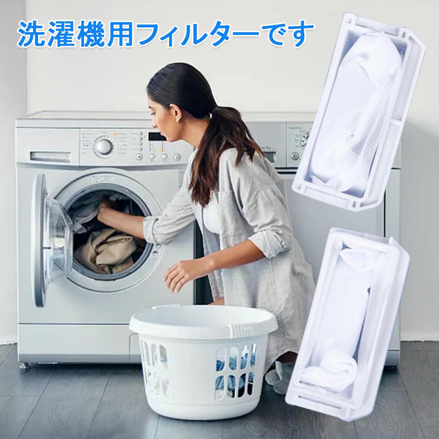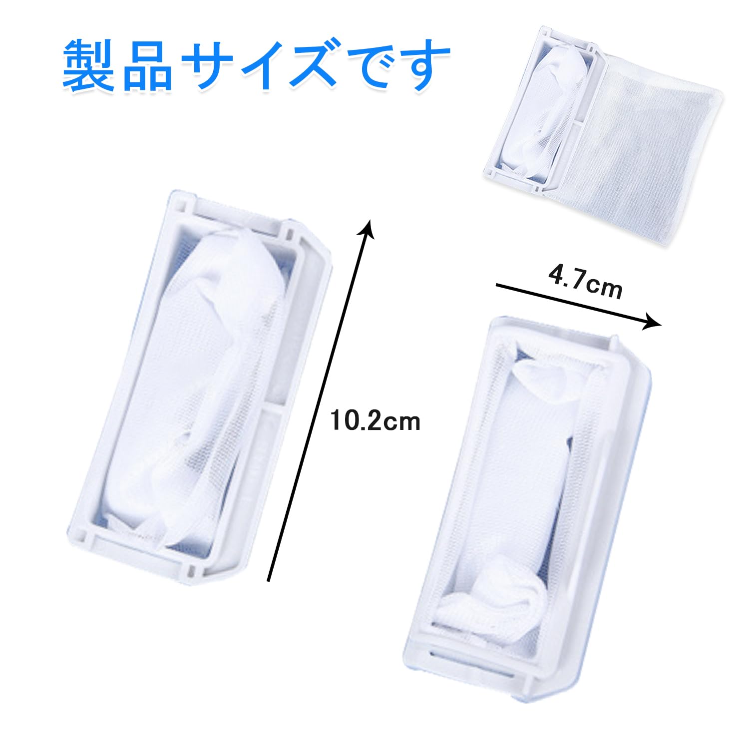 【商品仕様】糸くずフィルターの寸法:約10.2×4.7cm 材質:プラスチック+ナイロン網 2個セット