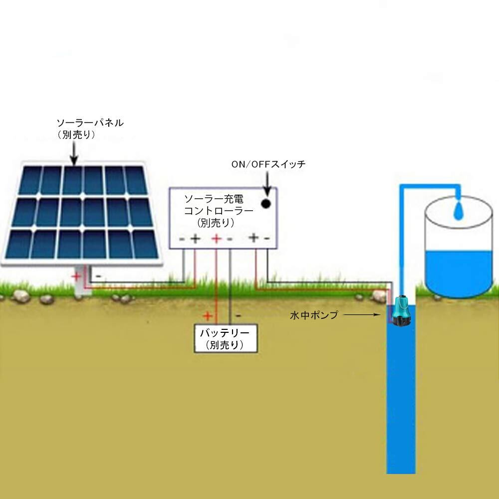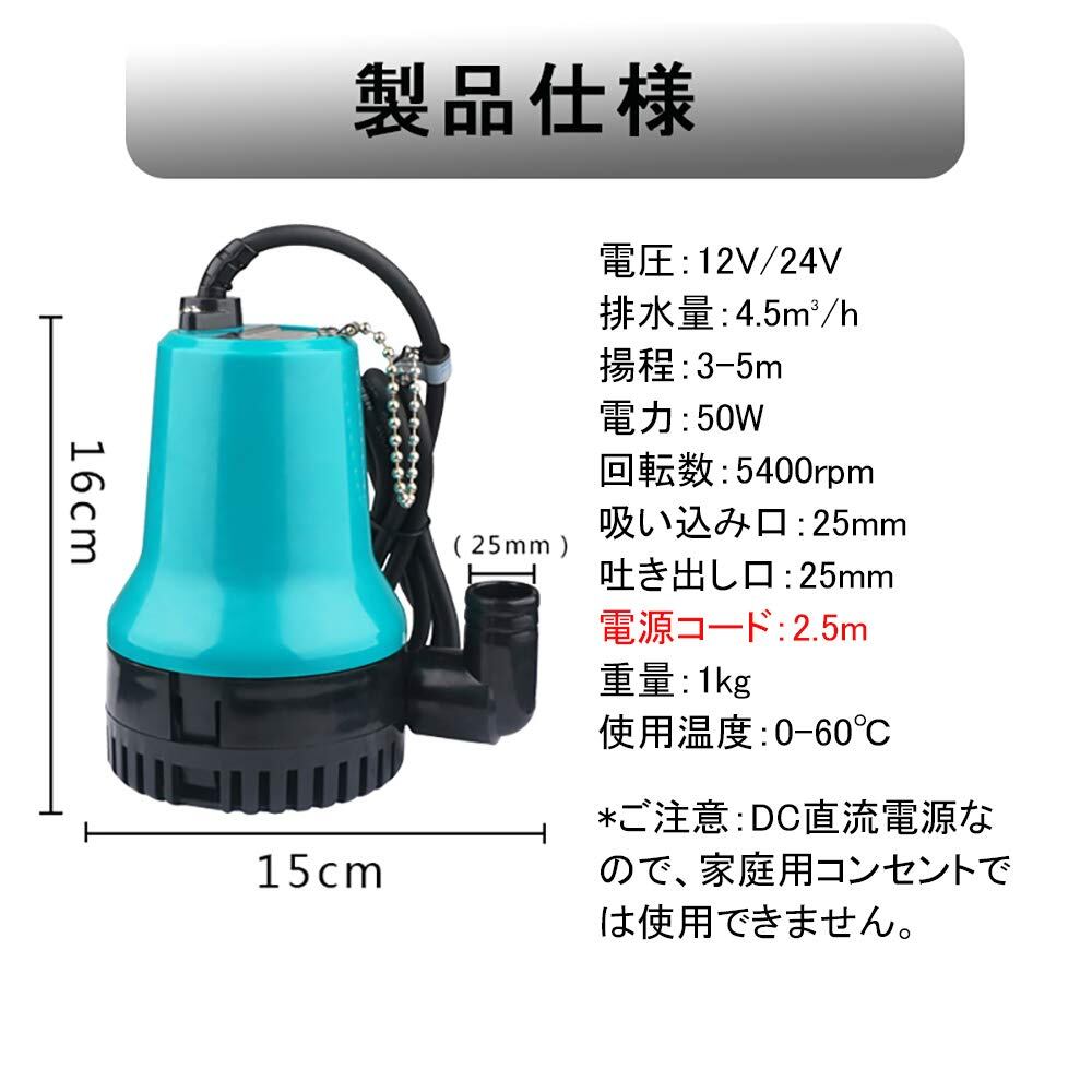 入力電圧:DC 12V(家庭用電源では使えない) 入力電流:5.4A 電力:50W 吐出量:70L/min(4.5m3/H)最大揚程:4m 海水対応:可