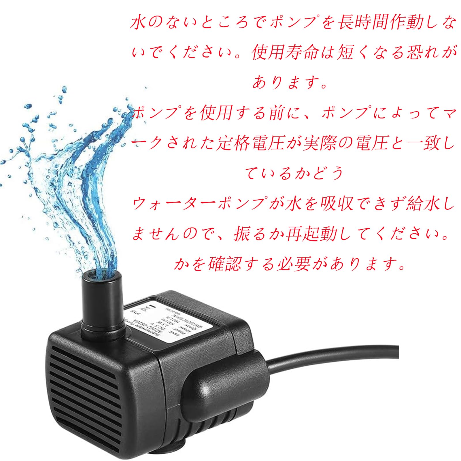 ?アクアリウム、水族館、水槽や噴水、池など、水循環が必要な場所はもちろん、家庭プールの吸水排水にもお使い頂けます。ウォーターポンプが水を吸収できず給水しませんので、振るか再起動してください。