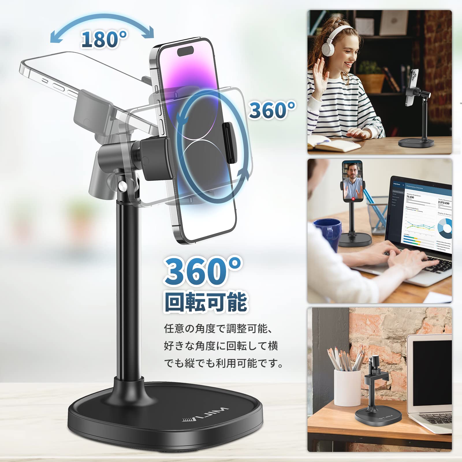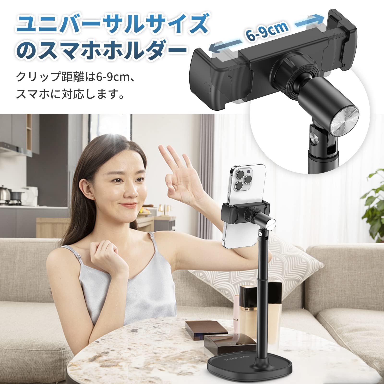 【利用シーン】:自宅/オフィスで様々スマホのサポートが調整できます。楽にレシピ、テクニック、FaceTime、ズーム会議、ビデオ録画、ビデオ通話、オンライン会議、オンラインフィットネス、映画鑑賞、読書、ゲーム、ライブ配信などをすることができます。風景やポートレートモードにも適応しています。