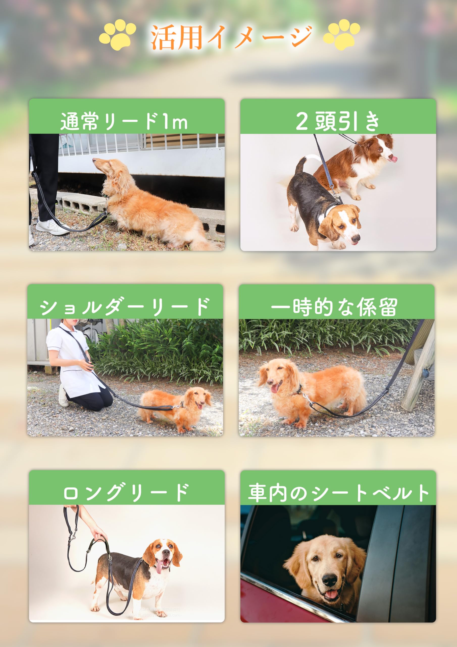 ショルダーリードとして使う場合 本体を斜めに掛け、先端フックを首輪またはハーネスのDカンに接続してください。散歩中に長さが変わりにくいよう、余りベルトは体側に調整しておくと快適です。