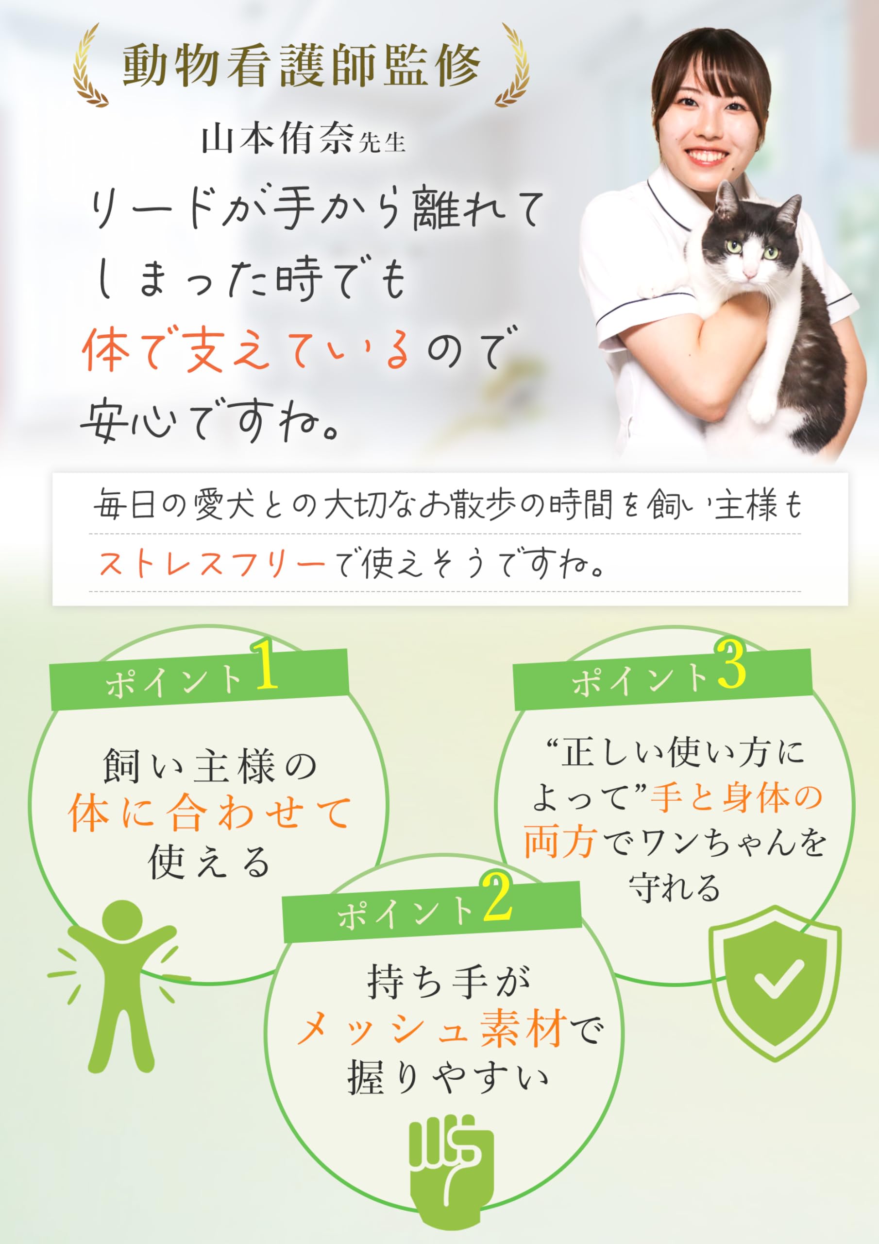負担を抑える2cm幅テープ&軽量約280g 肩当たりがやさしく、持ち替えて手持ちリードとしても使えます。
