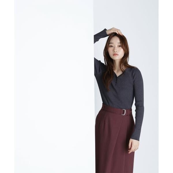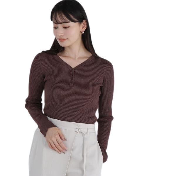 繊細なラメ糸が艶めき、Vネックとアクセントボタンでこなれた抜け感を作るリブニット。すっきりとしたVネックがデコルテを美しく見せ、軽やかな印象です。細めのリブ編みが体に沿い、程よいフィット感ですっきり着られるデザイン。ONにもOFFスタイルにも着回せて、1枚で様になる汎用性の高さも魅力です。
