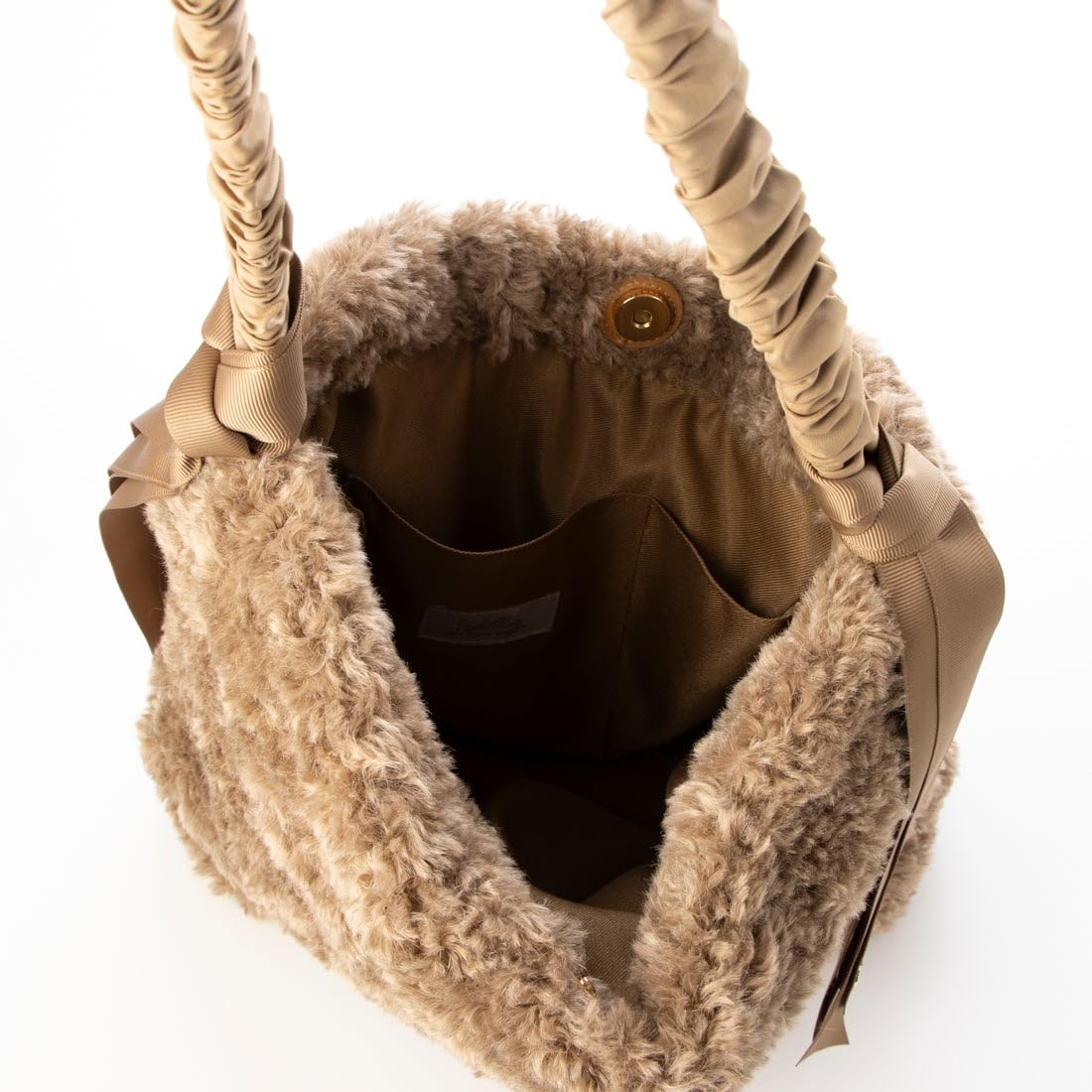 くるくるした毛並みのボアとギャザーを寄せたハンドルがフェミニンなワンショルダートート。