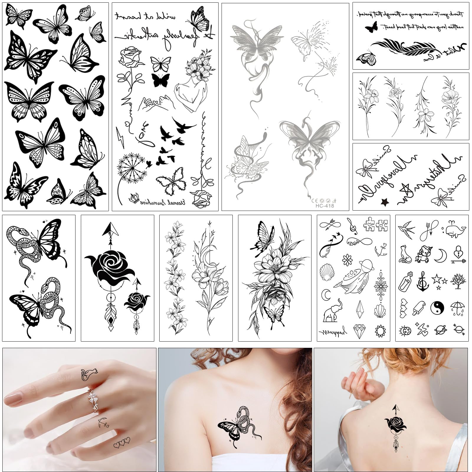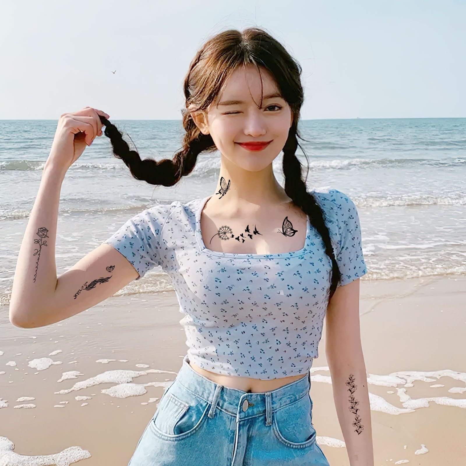 様々なデザイン:蝶々、花、笑顔、文字、猫、笑顔、星、ハート、オーナメント、音符、サソリなど、このタトゥーシールには数十種類のデザインがあります。更に、サイズもたくさん用意しているので、指や手首、足首、胸、デコルテ、耳の後ろ、肩、背中、お腹、腰など、ほとんど部位に対応できます