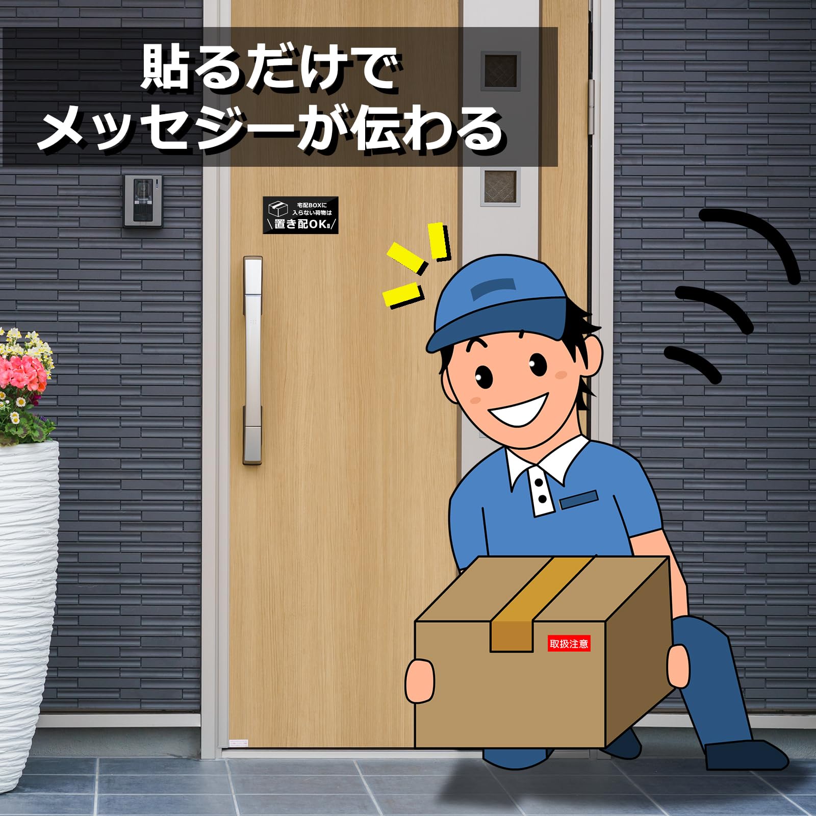 玄関のドアやインターホンの近くに貼ることにより、配達員に置き配希望を知らせることができます。