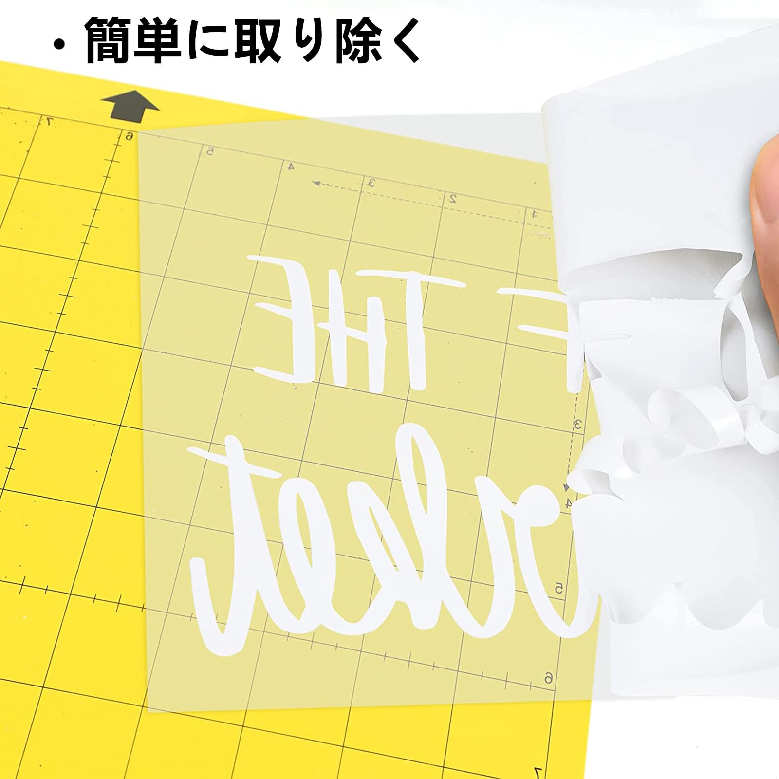 【転写の方法】1.デザインは反転の状態で裏面(糊面)からカットします。2.カットが完了したら貼りたい部分以外のいらない部分を取り除きます。3.それから裏返して透明のPETシートが表になるようにします。4.PETシートの上からアイロンで圧着します。5.アイロンをかけ終わったあと、熱が冷めてからゆっくりとPETシートをはがします。
