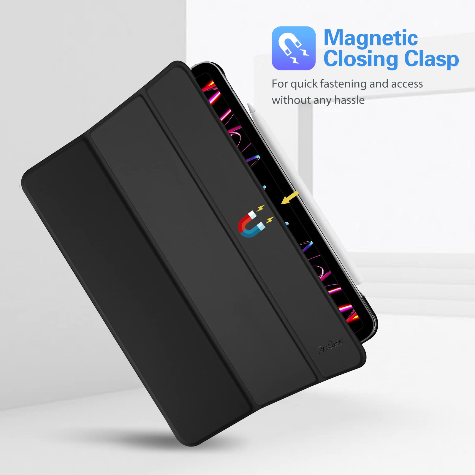 ProCase iPad Pro 12.9 ケース 第6/5/4/3世代に適用(2022 2021 2020 2018) スリム 三つ折り スタンド スマートカバー Pencilのペアリングと充電に対応 - ブラック