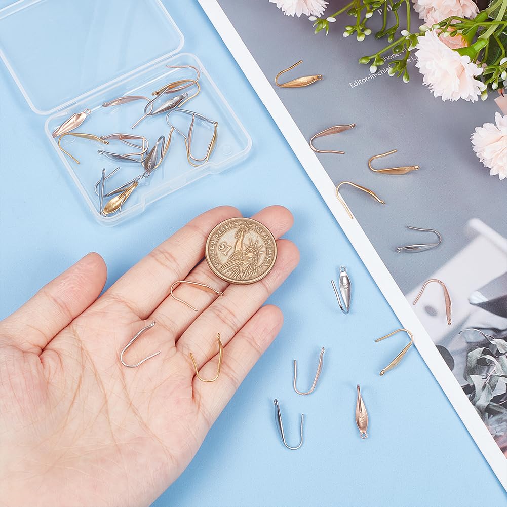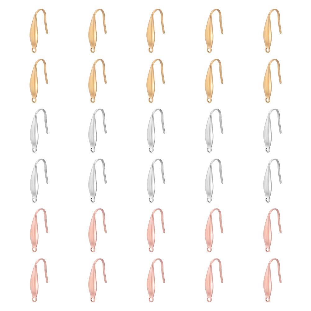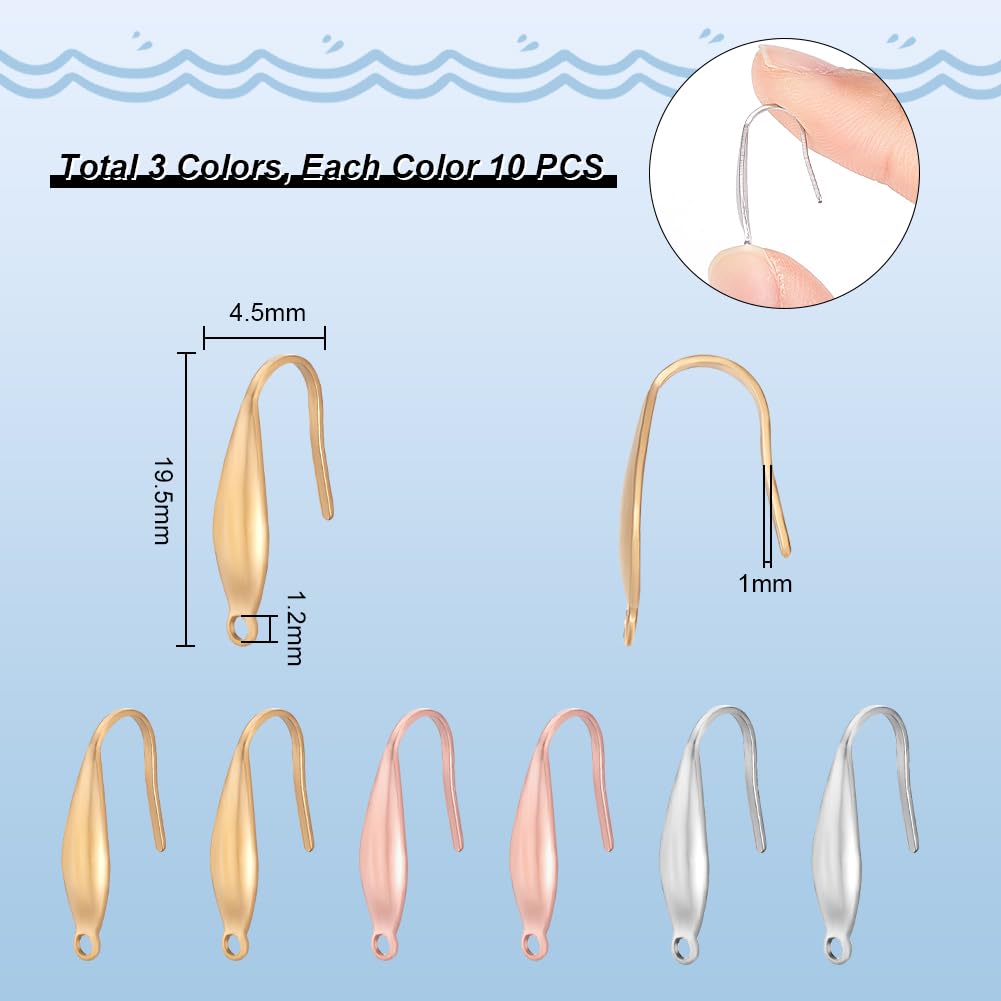 ?サイズ&内容?:3色のイヤリングフック、各色の10個があります。合計:30個;色:ゴールデン/ステンレス色/ピンクゴールド;サイズ:19.5x4.5x1mm、穴径:1.2mm;お気に入りのイヤリングと耳飾りを製作しましょう!