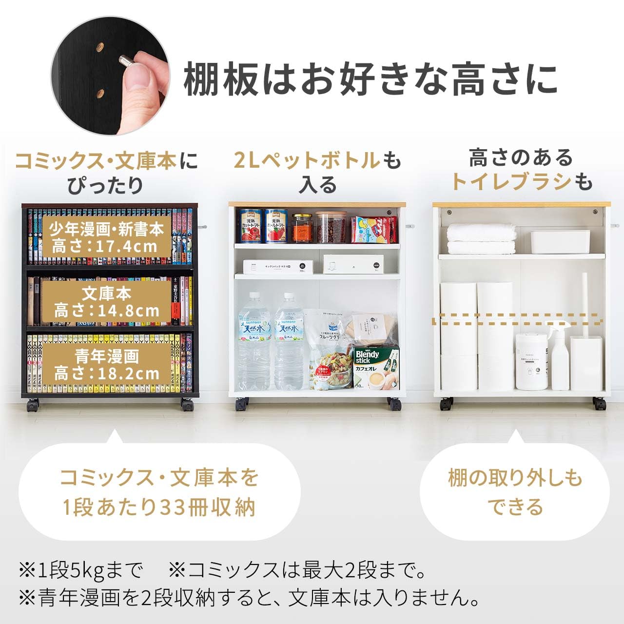 横幅約15.5cmのスリム設計で、押し入れやクローゼットの他にデスク周りやキッチン周りなどの隙間にも収納することができます。