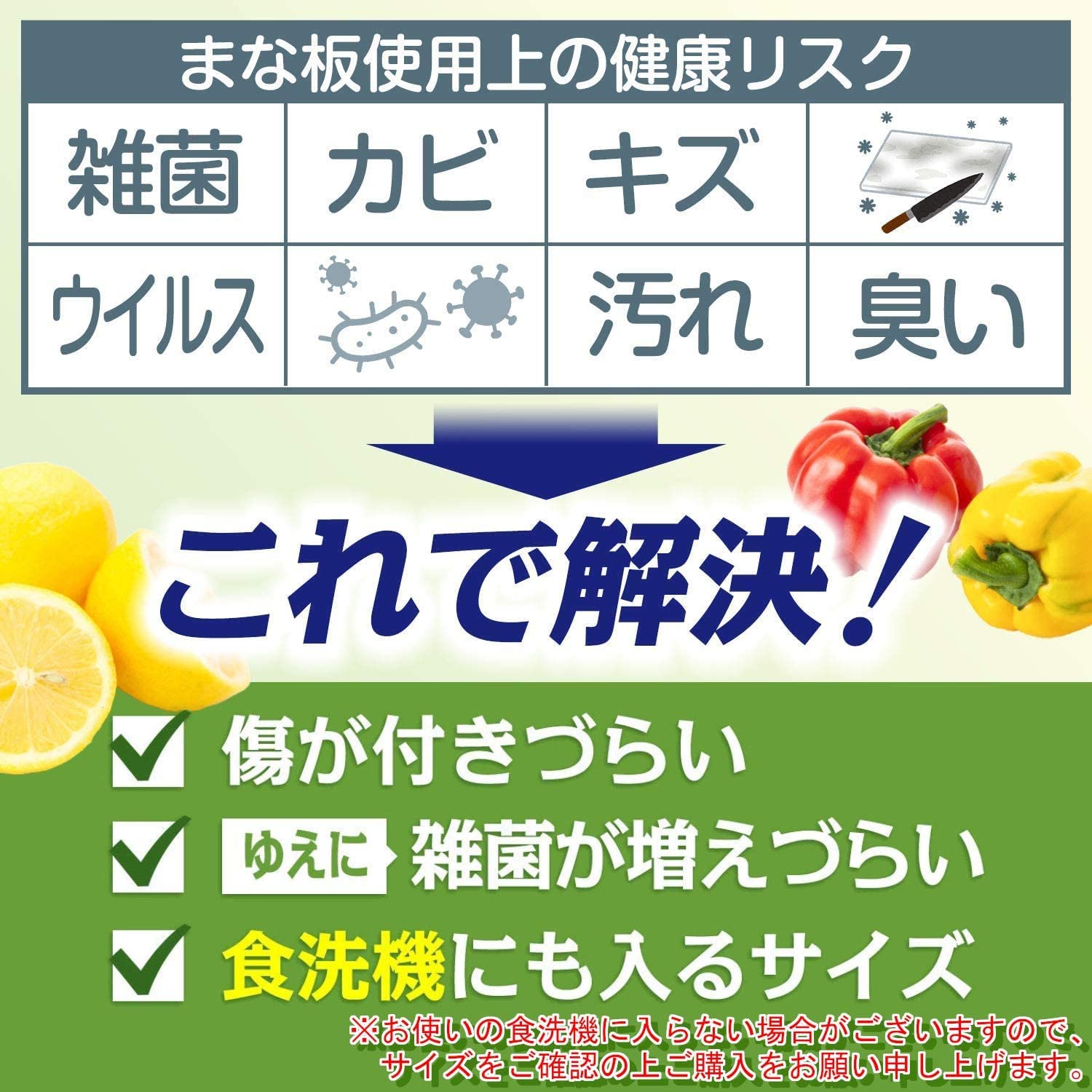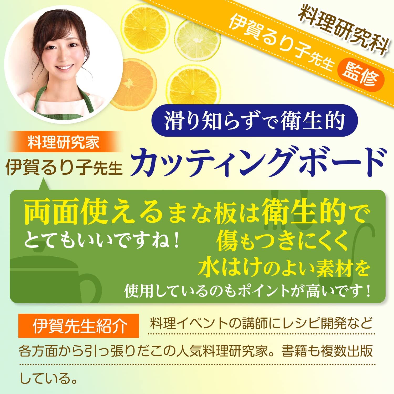 ?【商品基本仕様】主婦100人の「あったら良いな」という意見を反映し、1.滑らず 2.両面使えて 3.衛生的 な商品を開発致しました。生ものを切るときは表側・それ以外を切るときは裏側と分けて使えるから食中毒予防にもオススメです。また、洗った後の水の切れは衛生的である証で、水洗い後ふきんで軽く拭くだけで水が切れてるためお手入れがとても簡単です。本体 薄黄クリーム色:ポピプロピレン(PP)、縁側黒色:熱可塑性エラストマー(TPE)。サイズ:33.5 x 23.5 x 1.0cm。本商品は縁側の黒い部分がゴムのような質感となっているため滑りにくい構造となっております。※光の加減などによって実物と異なる色味に見える場合がございます。品質に問題はございませんのでご安心くださいませ。