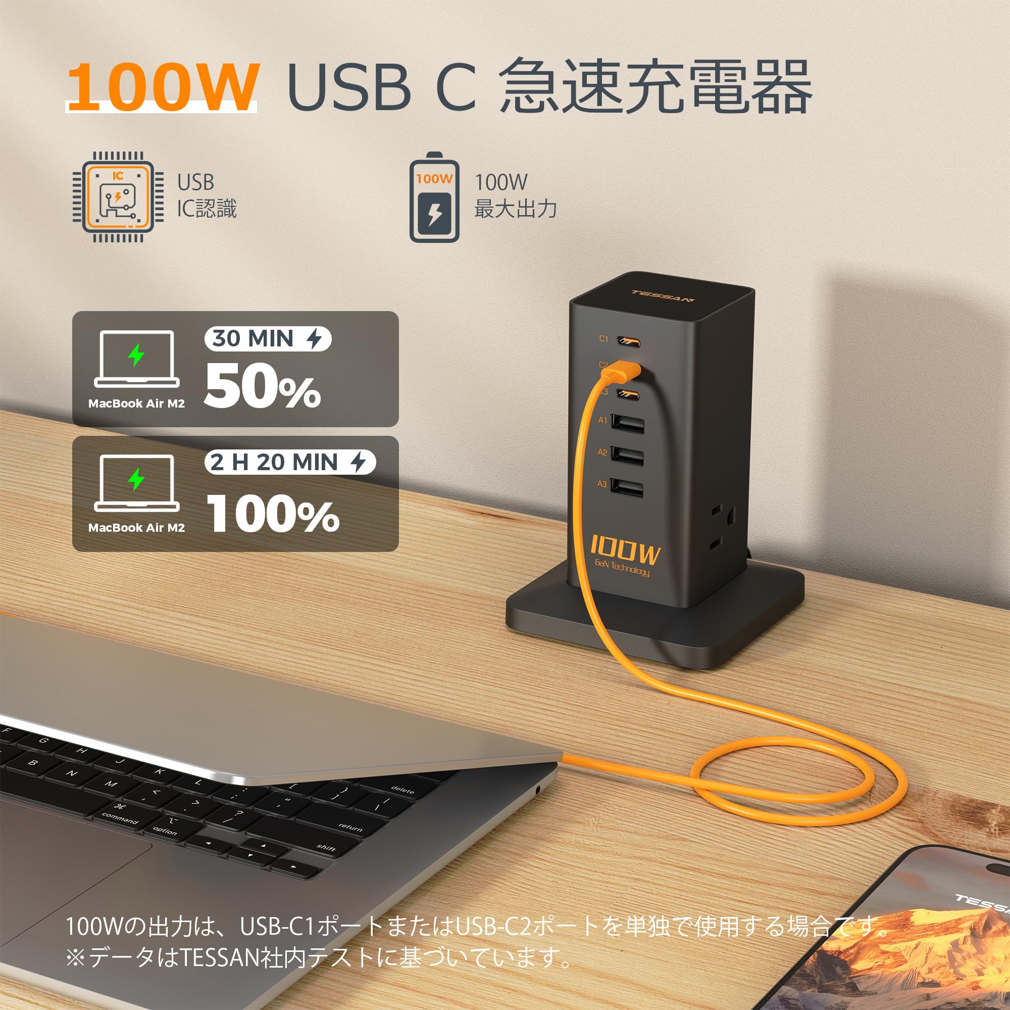 【最大100W出力usb type-c充電器 】USB-C1またはUSB-C2を単独で使用する場合、単ポート100Wの急速充電が使用でき、USB-C3の最大出力は30W、USB-Aポートの最大出力は12Wです。最適な充電速度を提供し、30分でスマートフォンを0%から50%までの充電が可能です。 効率を高め、充電時間を節約します。