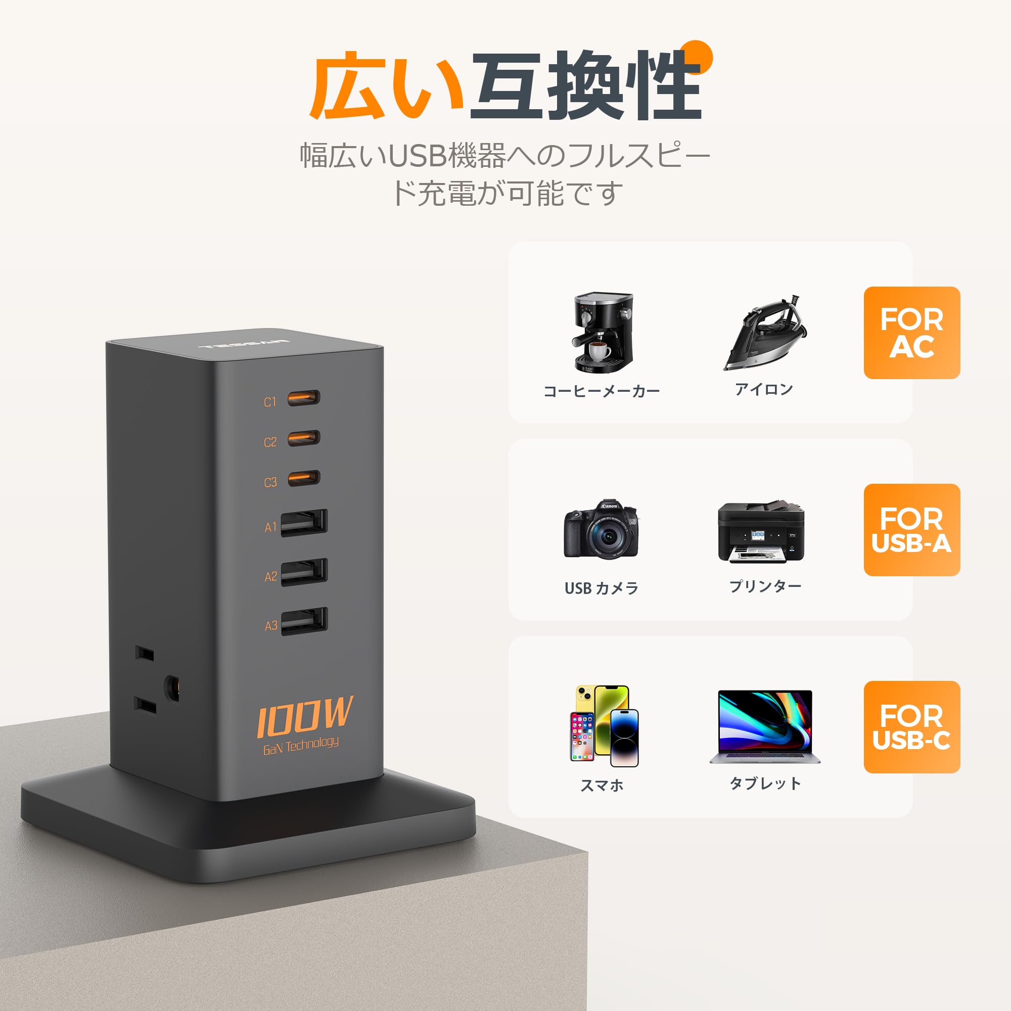 usb充電器 type-c 100W 延長コード 2m PD スマホ急速充電器 usb コンセント 電源タップ タワー usb c付き 6ポート3AC差込口 GaN採用 MacBook iPhone Galaxy Android など機器対応