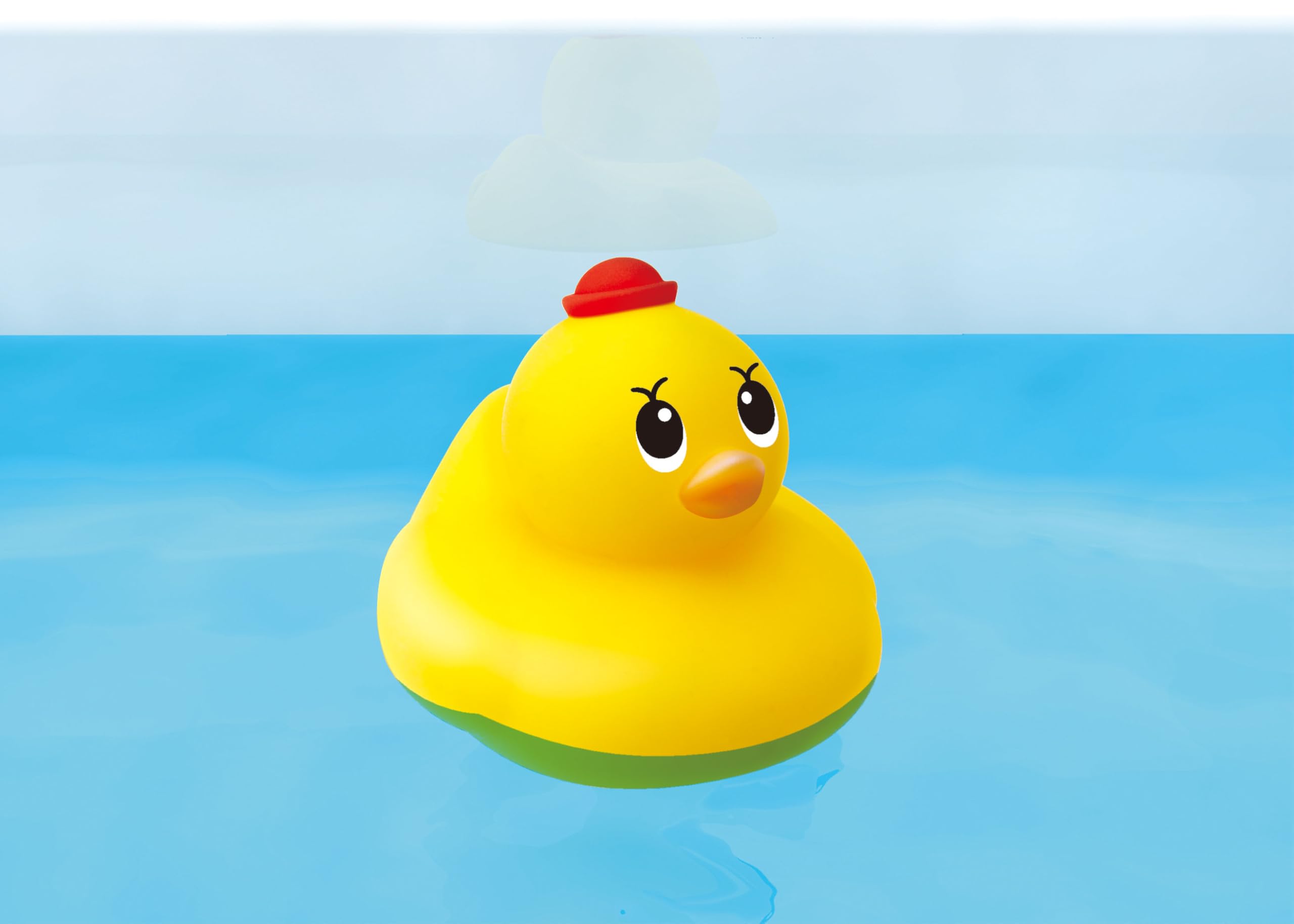 バスタイムを彩るアヒル隊長の形をしたみずてっぽう!おふろの水面に浮かぶから、「アヒル風呂」にも最適。