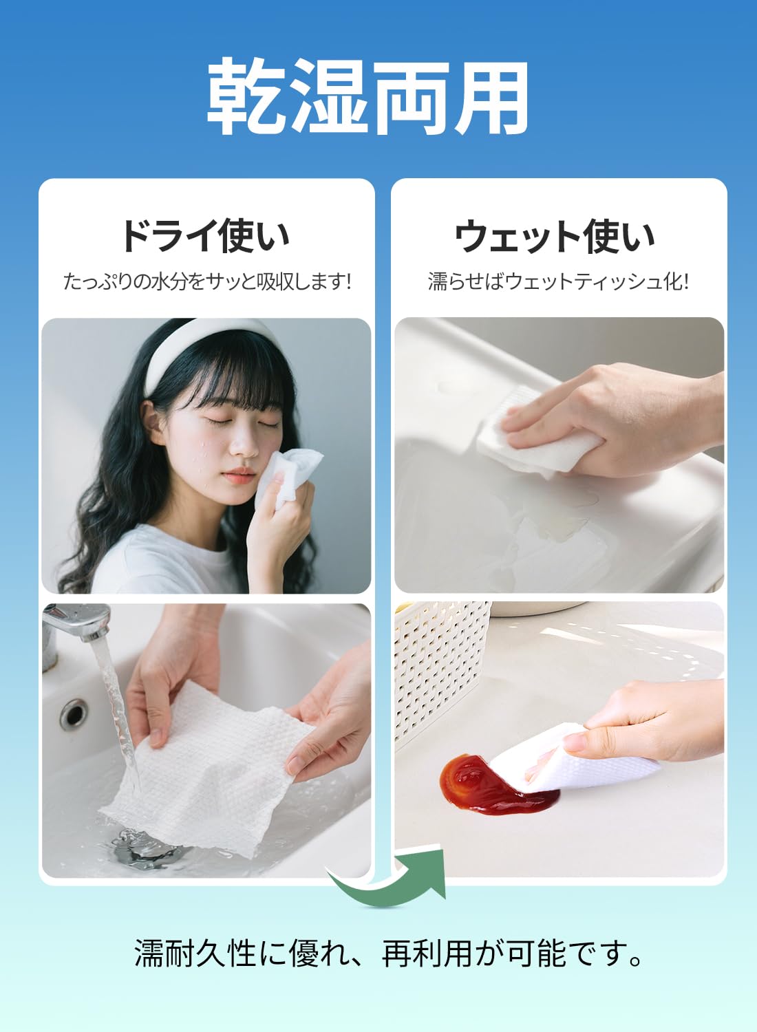 ?乾湿両用:このフェイスタオルはウェットでもドライでも使えます。乾いた状態では大量の水分を吸収でき、吸水後はウェットティッシュとして使えます。さらに再利用も可能です。