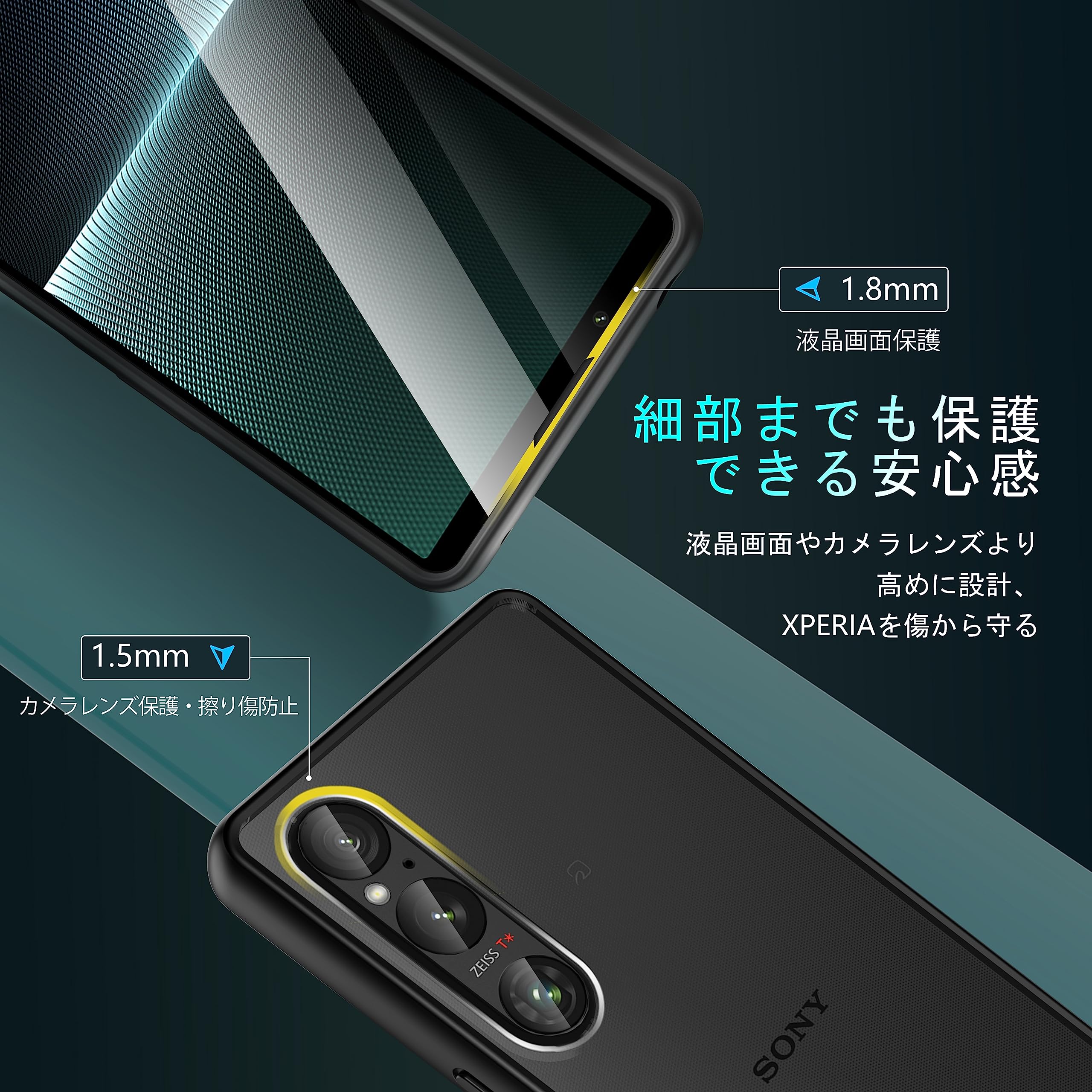 【液晶画面&カメラレンズ保護】本体の曲線に従って高低差設計があり、液晶画面より1.5mm高めで、端末を下向きに置いても机などの面に当たりません。フィルムを貼った状態でも画面より高さがあり、落としてしまった際でも画面は守られます。カメラレンズよりもケースのカメラ枠の方が出っ張っているので、気を使う事なくカメラ面を下にして本体を置く事が可能になりました。全方位からエクスペリア1Vをしっかりと守ります。