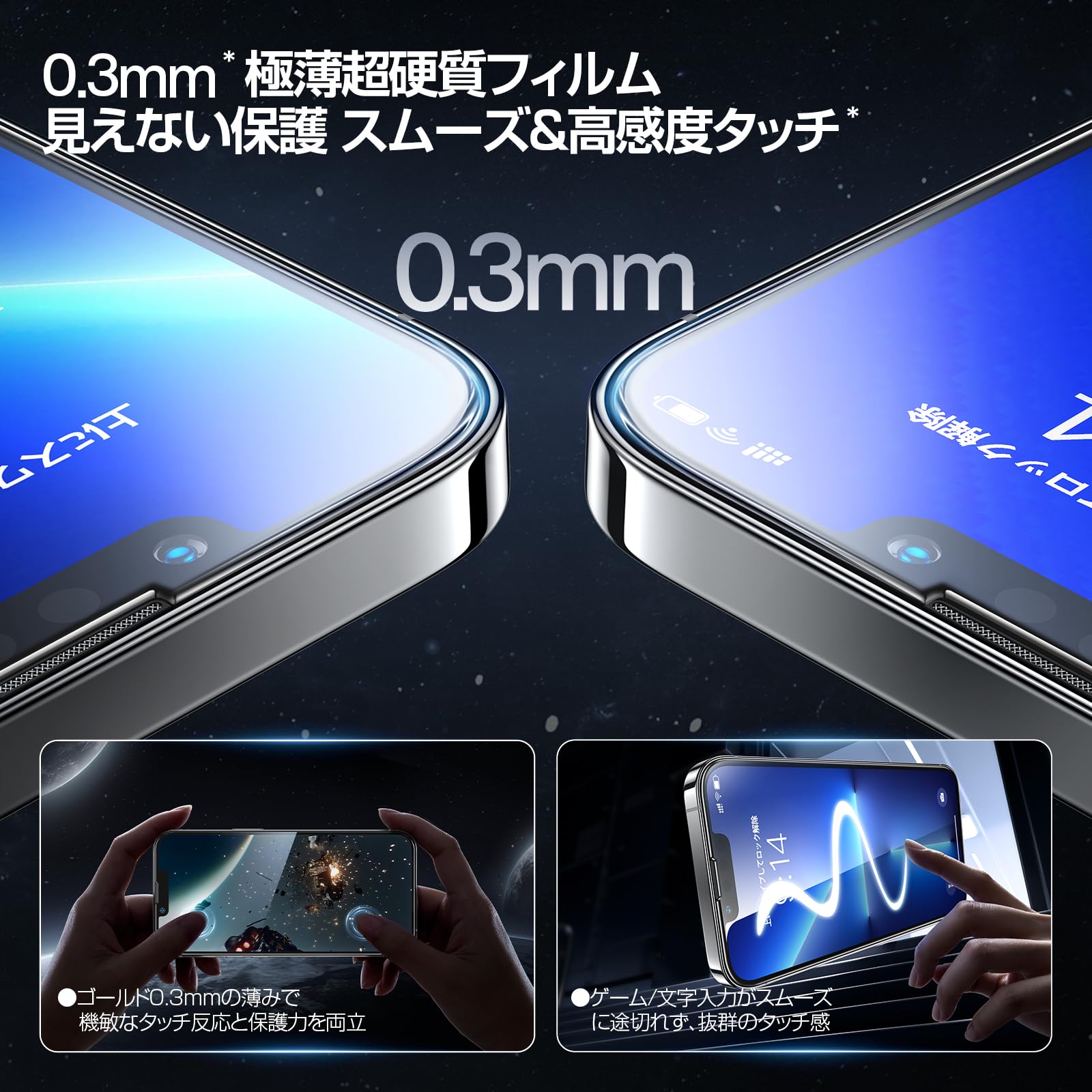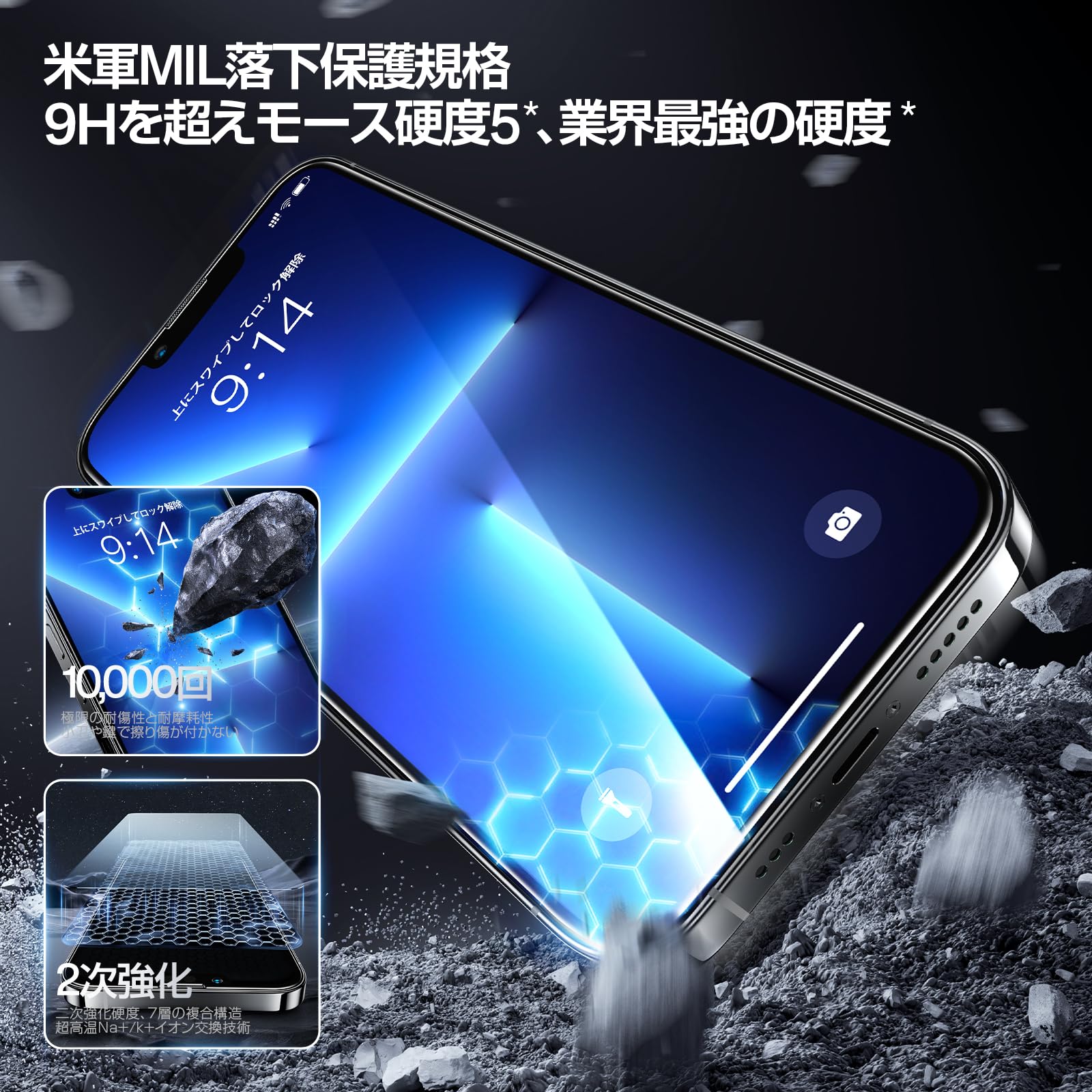 【究極のスムーズな感触・指紋防止】ハスの葉を模倣したAFテクノロジーや日本信越製防汚コーティング剤を採用し、耐水性、耐油性、耐指紋性を持つ防汚ナノコーティングが形成され、指紋を気にすることなく日常的に使用し、画面を綺麗に保つできます。極限摩擦を10,000回繰り返しても、究極の滑らかな高感度タッチを保ち続けます。1億3700万人を超えるユーザーから絶賛され、非常に優れたご利用体験となっております。実物機種で1:1ベースの金型製作に基づいて、Phone14 Plus/Phone 13 Pro Maxのための最も適した強化ガラスフィルムで、貼付け時の失敗が大幅に軽減されます。