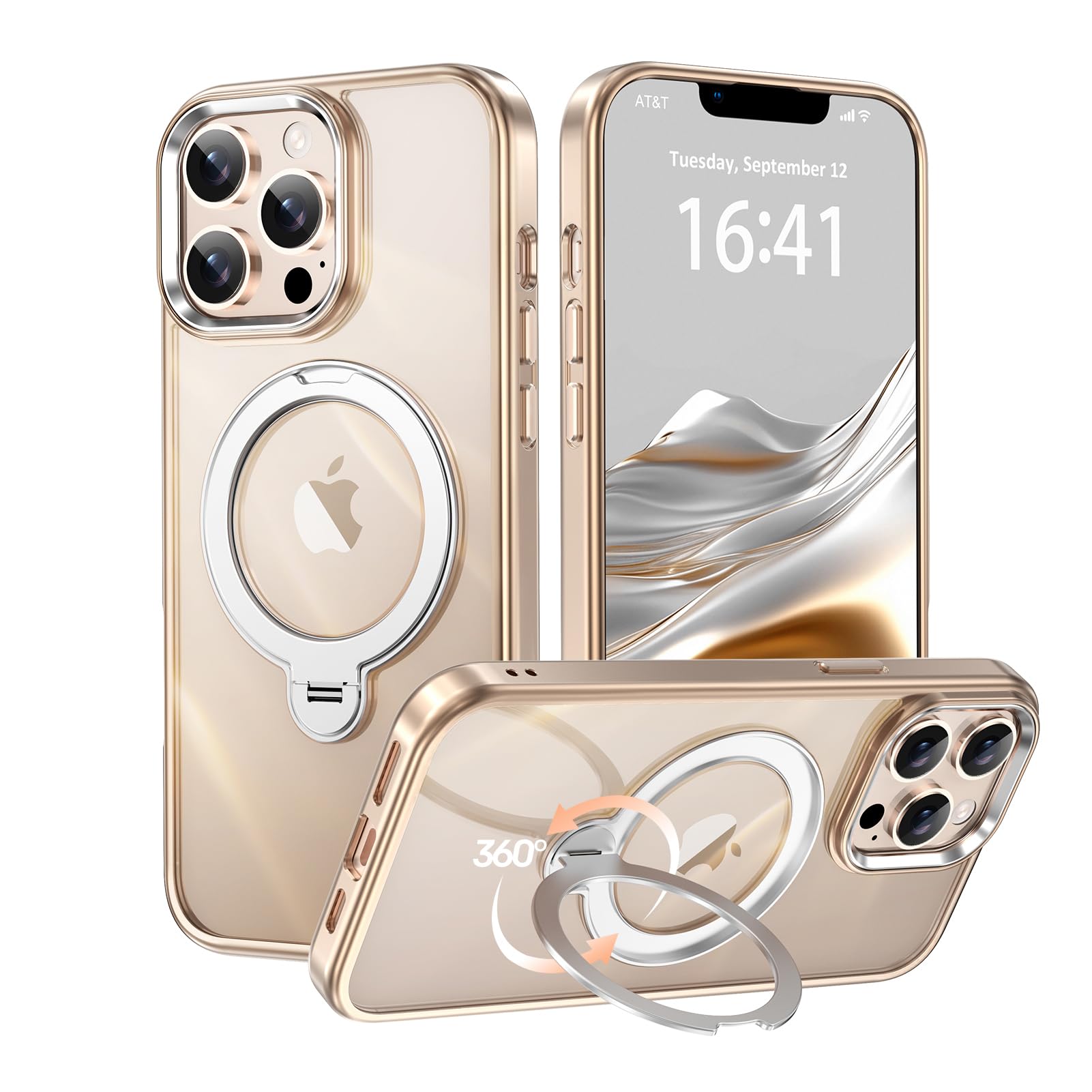 【透き通る上質感・多機能360°回転スタンド】KMAMBNG iPhone 13 ProMax 用 ケース Magsafe対応【耐衝撃・金属感・真空メッキ・黄変防止・ストラップホール付き】縦横両立 角度自在 調整可能 磁吸機能でワイヤレス充電対応 おしゃれ スマホケース (ローズゴールド iPhone 13 Pro Max)