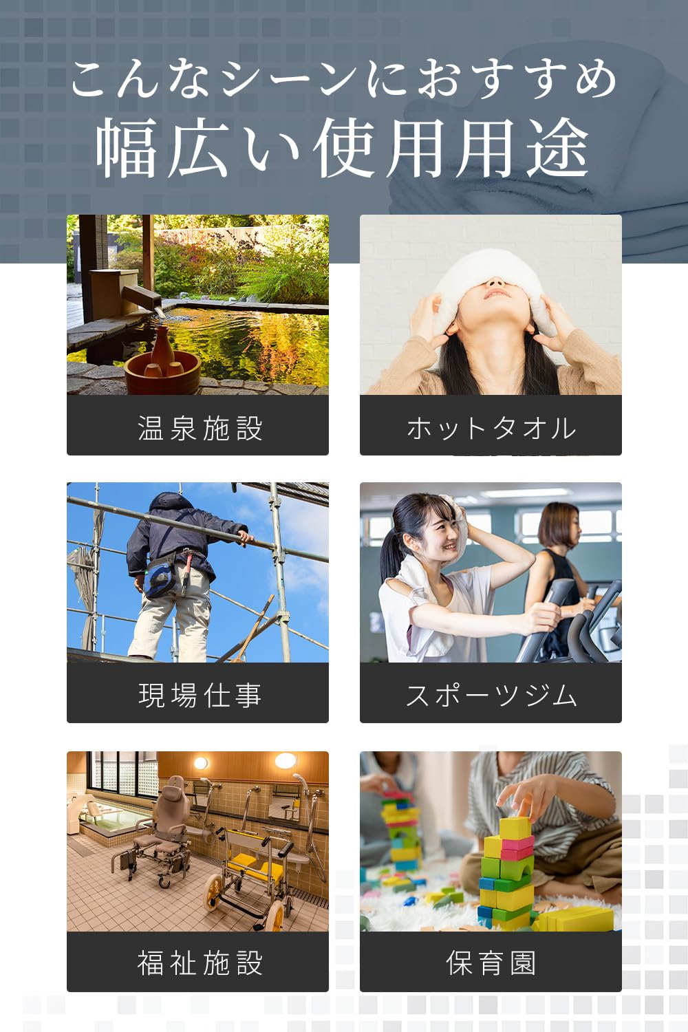 【様々な用途で使える万能フェイスタオル】一般的なフェイスタオルよりも少し長めの設計にしたことで、一般的なデイリーユーズから旅館・ホテル・レストラン等の業務用、災害時の備えとして様々な用途で使用できる万能なフェイスタオル
