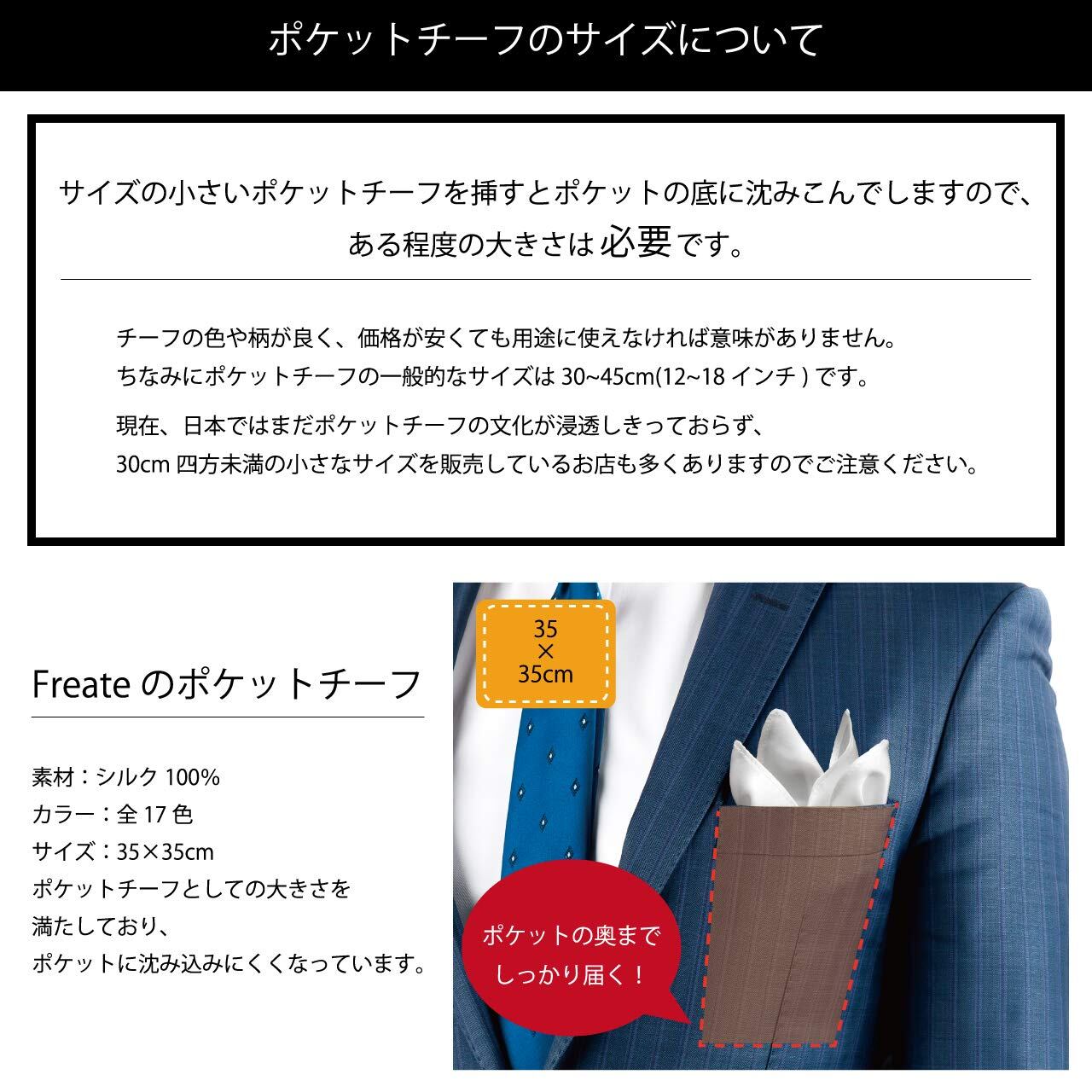 【特価セール】[Freate] ポケットチーフ シルク100% 大判35×35cm 折り方ガイド付き