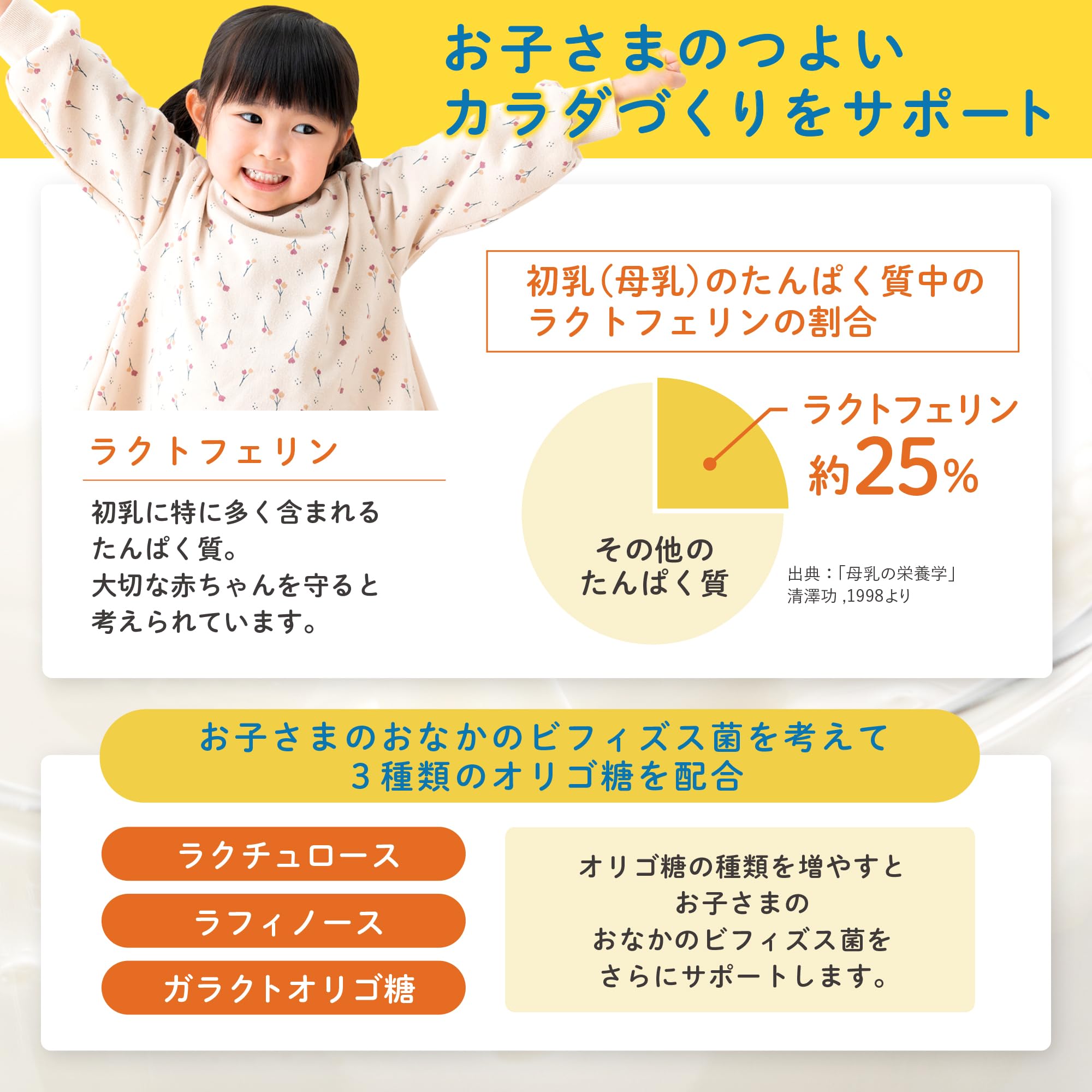 【こだわりポイント2:カラダつよく】生きた2種類のビフィズス菌(BB536・M-16V)、ビフィズス菌を増やす3種類のオリゴ糖を配合。ラクトフェリンは母乳に含まれ、赤ちゃんの健康に重要と考えられています。