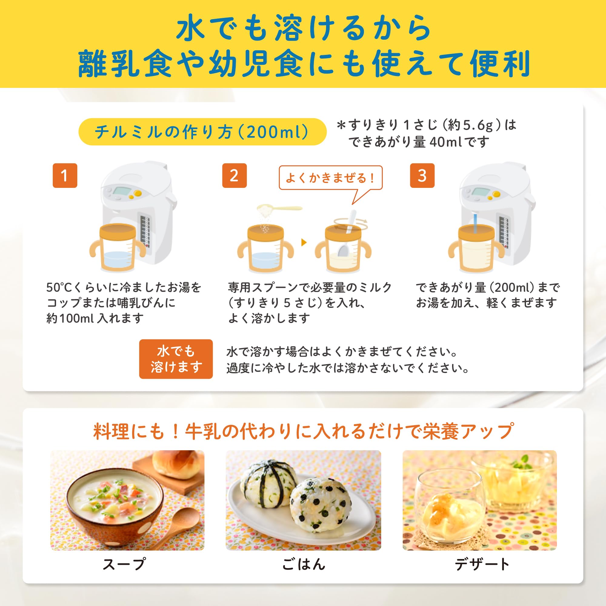 【幼児期のお子さまに】1歳頃~3歳頃までのフォローアップミルク チルミル(満9ヶ月頃からでもご使用いただけます。離乳食が3回食になった頃からを目安としてください)。チルミルは、幼児期のお子さまに大切な栄養をバランスよく配合しています。